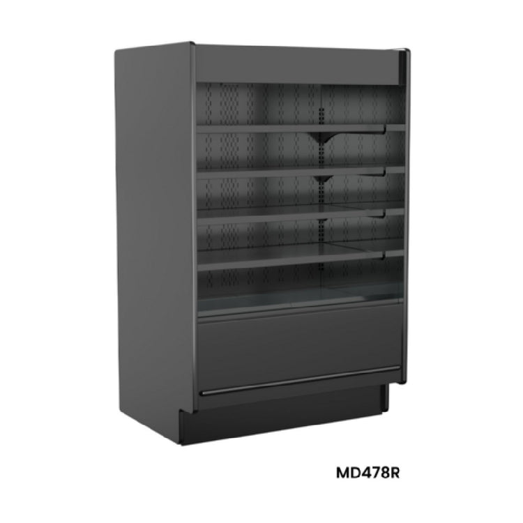 The Structural Concepts MD678R Fusion® Self-Service Refrigerated Display Case is a meticulously crafted unit measuring 72"L x 37-1/8"D x 78-1/2"H, designed for businesses that require an efficient refrigeration solution. This open reach-in front display case is fitted with LED top and shelf lights, enhancing product visibility while maintaining energy efficiency. The system operates with a remote DX refrigeration setup, ensuring optimal cooling performance. The stainless steel rear exterior provides durability and a sleek look, while the powder-coated Silversan black finish adds an extra layer of protection against bacteria. The electrical specifications include a power usage of 2.64 amps and 147 watts, operating on a 110-120v/60hz/1ph circuit, making it suitable for most commercial environments. Recognized with cETLus and ETL-Sanitation certifications, this display case meets rigorous safety and sanitation standards. The Structural Concepts MD678R is ideal for various segments within the food service industry, including grocery stores, delis, and cafes, offering a reliable and visually appealing solution for showcasing refrigerated goods. Its thoughtful design and advanced features make it a standout choice for establishments aiming to enhance their food presentation and storage capabilities.