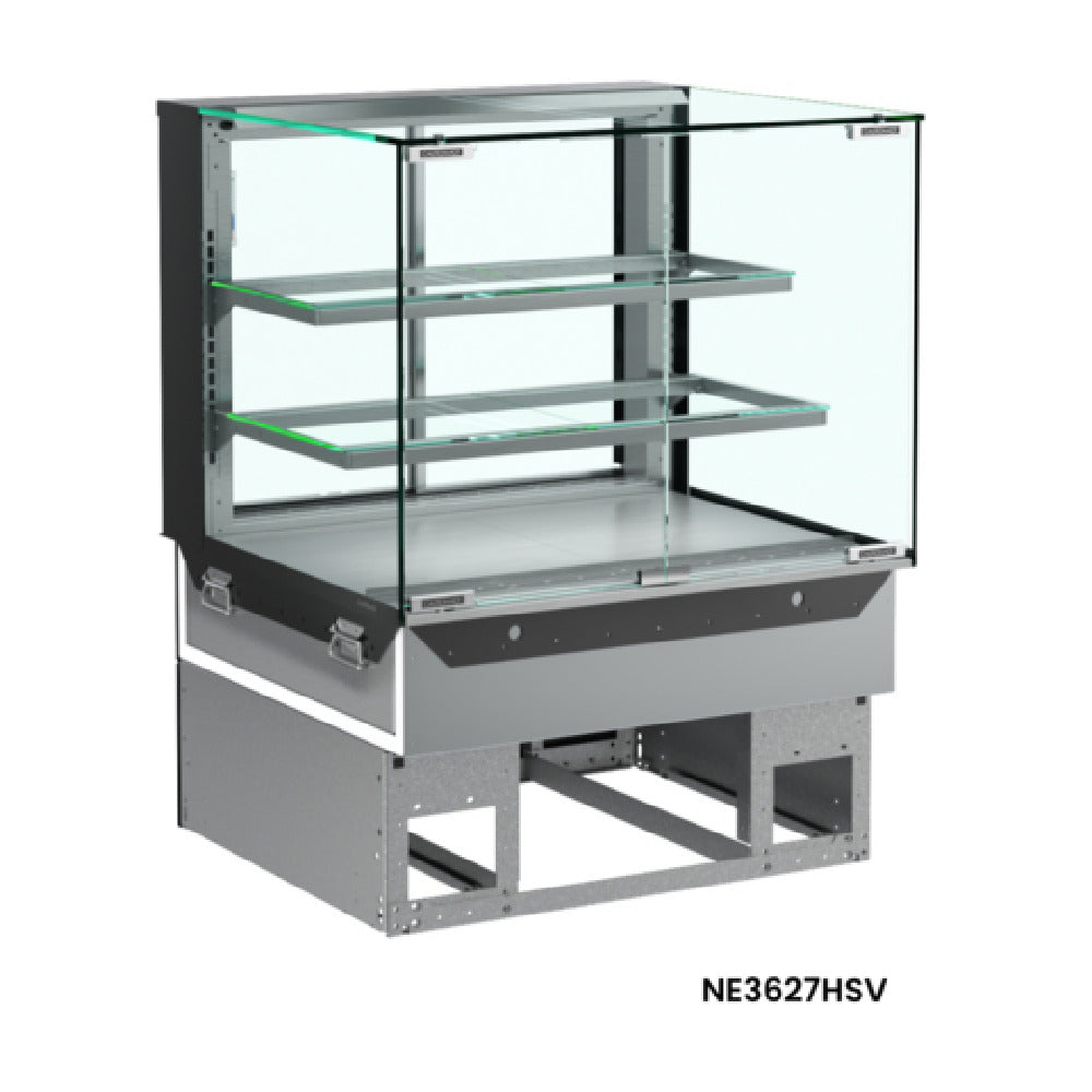 The Structural Concepts NE3627HSV Reveal® Service Heated Slide In Counter Case, with dimensions of 35-3/4"W x 27-7/8"H (above counter) and 47-1/8"H (overall), is engineered to enhance food display operations in various service environments. This unit features two removable and adjustable clear glass shelves, providing customizable display options to accommodate different product sizes and presentation styles. The convection heat system ensures consistent thermal distribution, keeping food items at optimal serving temperatures. With LED lighting at the top and on the shelves, the case illuminates food products, enhancing their visual appeal and attracting customer attention. The slide-in base design and glass ends ensure seamless integration within existing counter setups, while rear sliding glass doors facilitate easy access for service personnel. Constructed with a stainless steel interior, this counter case combines durability with a modern aesthetic. Certified by cETLus and ETL-Sanitation, it complies with rigorous safety and sanitation standards, and adheres to DOE 2017 energy efficiency guidelines. The NE3627HSV is ideal for food service establishments seeking a reliable and visually appealing heated display solution to maintain the quality and presentation of their culinary offerings.