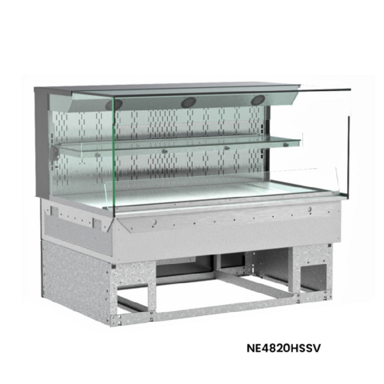 The Structural Concepts NE4820HSSV Reveal® Self-Service Heated Slide In Counter Case is a sophisticated display solution designed to enhance any retail environment. Measuring 47-3/4" wide, 33" deep, and 20-3/8" high, this unit boasts a compact yet functional size that seamlessly integrates into existing counters. The inclusion of a single clear glass shelf, which is both removable and adjustable, offers flexibility in product display configurations. This counter case utilizes convection heat technology, ensuring consistent warmth throughout the display area. LED lights are strategically placed at both the top and shelf levels to enhance product visibility and presentation. The slide-in base feature allows for easy installation, while the UV bonded frameless glass and glass ends provide an unobstructed view of the displayed items. A stainless steel interior ensures durability and easy maintenance. Certified by cETLus and ETL-Sanitation, this heated counter case meets essential safety and sanitation standards. Designed for versatility, the NE4820HSSV is ideal for a range of market segments within the food service industry, from bakeries and cafes to grocery stores, offering an efficient and stylish solution to showcase heated products.