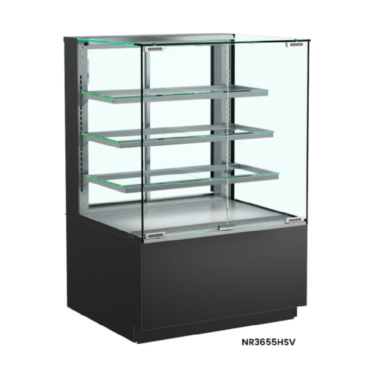 The Structural Concepts NR3655HSV Reveal® Service Heated Display Case - freestanding is a premium unit designed to enhance the presentation and preservation of food items. Measuring 35-3/4"W x 33"D x 54-5/8"H, this display case is equipped with three removable and adjustable clear glass shelves that ensure flexibility in showcasing various products. The convection heat system efficiently maintains optimal temperature levels, while the LED top and shelf lights provide excellent visibility of displayed items. This vertical unit features a swing-out front with UV frameless glass and full end panels that maximize product visibility while maintaining structural integrity. The clear glass rear sliding doors allow for easy access and restocking, promoting seamless operations in busy environments. The stainless steel interior offers durability and ease of cleaning, complemented by a sleek black exterior for a modern aesthetic. Enhanced with adjustable locking casters, the case provides mobility and stability. It meets cETLus and ETL-Sanitation standards and is DOE 2017 compliant, attesting to its safety and energy efficiency. This display case is ideal for various markets within the food service industry, offering a sophisticated solution for the presentation and warming of food items.