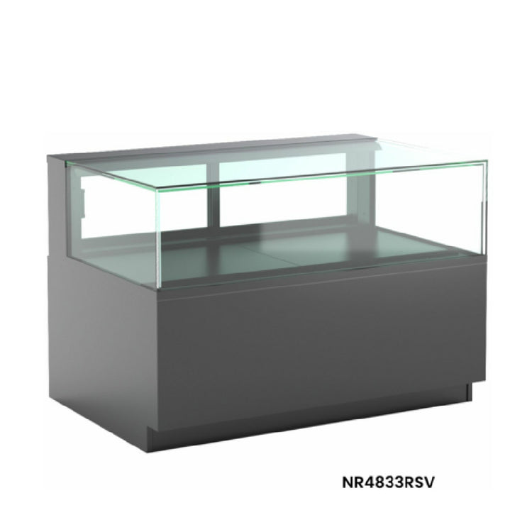 The Structural Concepts NR4833RSV Reveal® Service Refrigerated Case-Freestanding is a meticulously engineered display unit tailored for diverse market segments within the food service industry. With dimensions of 47-3/4"W and 32-7/8"H, this case features the advanced Breeze-E (Type II) with EnergyWise self-contained refrigeration technology, ensuring efficient cooling performance. It is equipped with an LED top light, enhancing the visibility of displayed items, and features vertical, fixed front & side UV frameless glass for unobstructed viewing. This refrigerated case is designed with full end panels and clear glass rear sliding doors, allowing easy access while maintaining optimal product presentation. The inclusion of a blue fin coated coil and a condensate pan underscores its commitment to durability and operational efficiency. The unit's black exterior and interior provide a sleek, modern appearance suitable for any contemporary setting. Certified by cETLus and ETL-Sanitation, the NR4833RSV meets stringent safety and sanitation standards. This freestanding case is an ideal solution for supermarkets, cafes, and delis, offering a combination of technological sophistication and aesthetic appeal to enhance product display and preserve freshness.