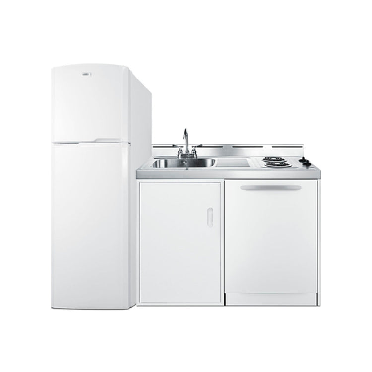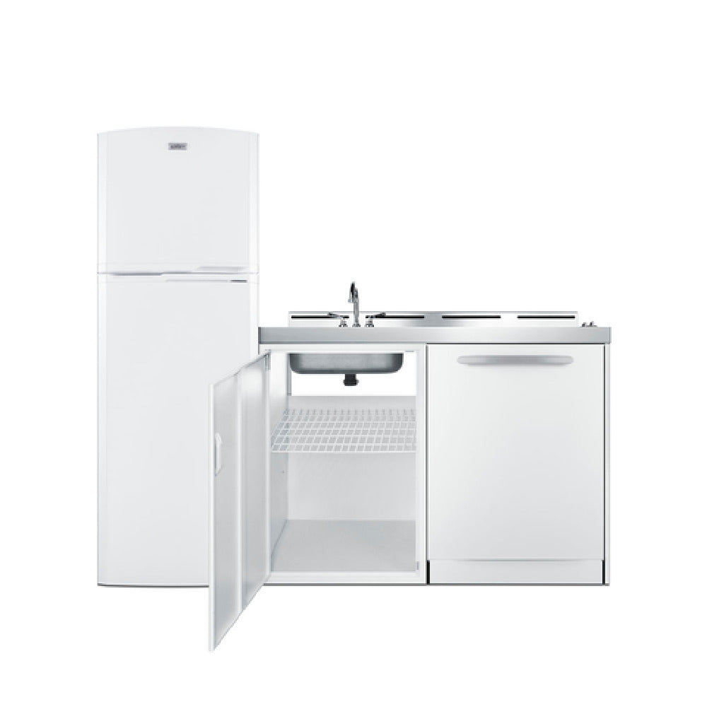 The Summit ACKDW72 All-in-One Combination Kitchenette With Dishwasher 72" W Overall is a versatile and compact kitchen solution designed for efficiency and convenience. This unit integrates multiple kitchen appliances, ideal for small spaces or commercial settings. The kitchenette features a 115v (2) burner coil cooktop with a pre-installed 3-prong power cord, ensuring easy installation and reliable performance. The 115v full-size refrigerator and freezer offer a 22" width, reversible door, and frost-free operation, providing 8.8 cu.ft. capacity with door storage, adjustable glass shelves, and a large crisper for organized food storage. A standout feature is the 115v, 24" wide dishwasher, which is ENERGY STAR® certified and ADA compliant, equipped with eight wash programs for versatility in cleaning. The one-piece stainless steel countertop is durable and easy to clean, complemented by a stainless steel work surface and a sink with a faucet. The kitchenette also includes a storage cabinet for added convenience. Finished in a classic white exterior, this unit is 100% CFC free and uses R134a refrigerant, ensuring eco-friendly operation. It meets cETLus residential safety standards and ships on three pallets for secure transport and delivery.