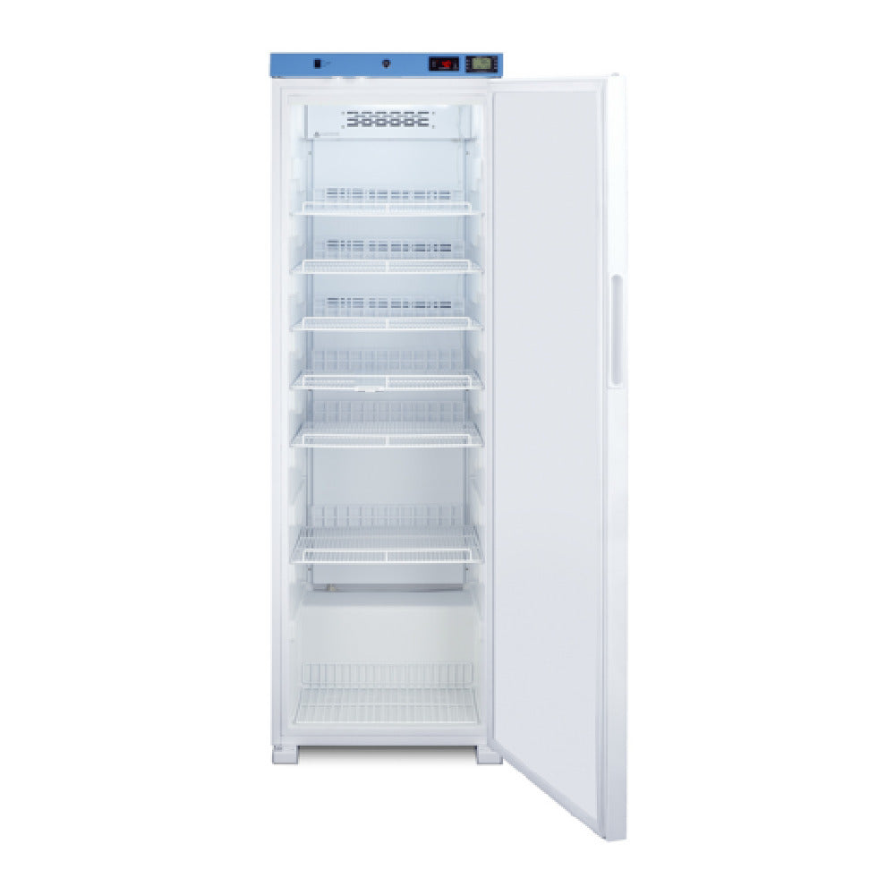 The Summit ACR1601W Upright Healthcare Refrigerator 24" Wide Freestanding Use is a high-performance storage solution, designed to meet the stringent demands of medical and laboratory environments. With a substantial capacity of 15.53 cubic feet, it accommodates a variety of medical supplies and samples. The temperature range is meticulously controlled between +2 to +8°C, supported by a digital thermostat and temperature memory function, ensuring optimal conditions are consistently maintained. An external temperature readout, along with alarms for high/low temperatures and open doors, provides enhanced monitoring capabilities. The refrigerator features an internal fan, automatic defrost, and LED lighting, ensuring energy-efficient operation and visibility. Six adjustable wire shelves and a self-closing, right swing solid door with a magnetic gasket offer flexible storage and secure closure. The thermometer probe, encased in a glass bead-filled bottle, and a pre-installed 3/8" probe hole with cover, facilitate easy integration of user-provided monitoring equipment. Its white exterior finish, flat door liner, and pocket handle contribute to a sleek, professional appearance, while the factory-installed lock and hospital-grade cord with 'green dot' plug assure safety and compliance. The eco-friendly design incorporates R600a refrigerant, aligning with CARB standards, and the unit operates at 115V/60 Hz, certified by ETL and ETL-C for healthcare use.