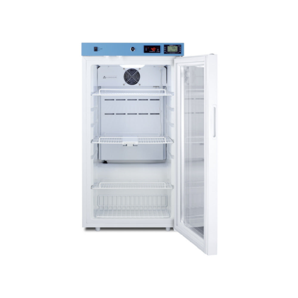 The Summit ACR32G Upright Healthcare Refrigerator stands out as a specialized solution for medical, laboratory, and healthcare environments with its compact 19-inch width and freestanding design. Featuring a storage capacity of 3.17 cubic feet, it maintains a precise temperature range of +2 to +8 °C. This unit is equipped with advanced features such as a temperature memory function and an external temperature readout, ensuring reliable performance and monitoring. The internal fan, coupled with a digital thermostat, guarantees consistent cooling, while the automatic defrost mechanism simplifies maintenance. It includes three adjustable wire shelves and a right swing glass door with a pocket handle for easy access. The flat door liner and magnetic door gasket enhance insulation and energy efficiency. For added security, the factory-installed lock and hospital-grade cord with a 'green dot' plug are included. The self-closing door and digital control panel further optimize functionality with alarms for high/low temperatures and open doors. The thermometer probe, encased in a glass bead-filled bottle, is stored centrally, providing accurate readings, while a pre-installed 3/8" probe hole allows for additional equipment installation. Eco-friendly with R600a refrigerant, this refrigerator adheres to ETL and ETL-C healthcare standards, offering a reliable and compliant solution for sensitive storage needs.