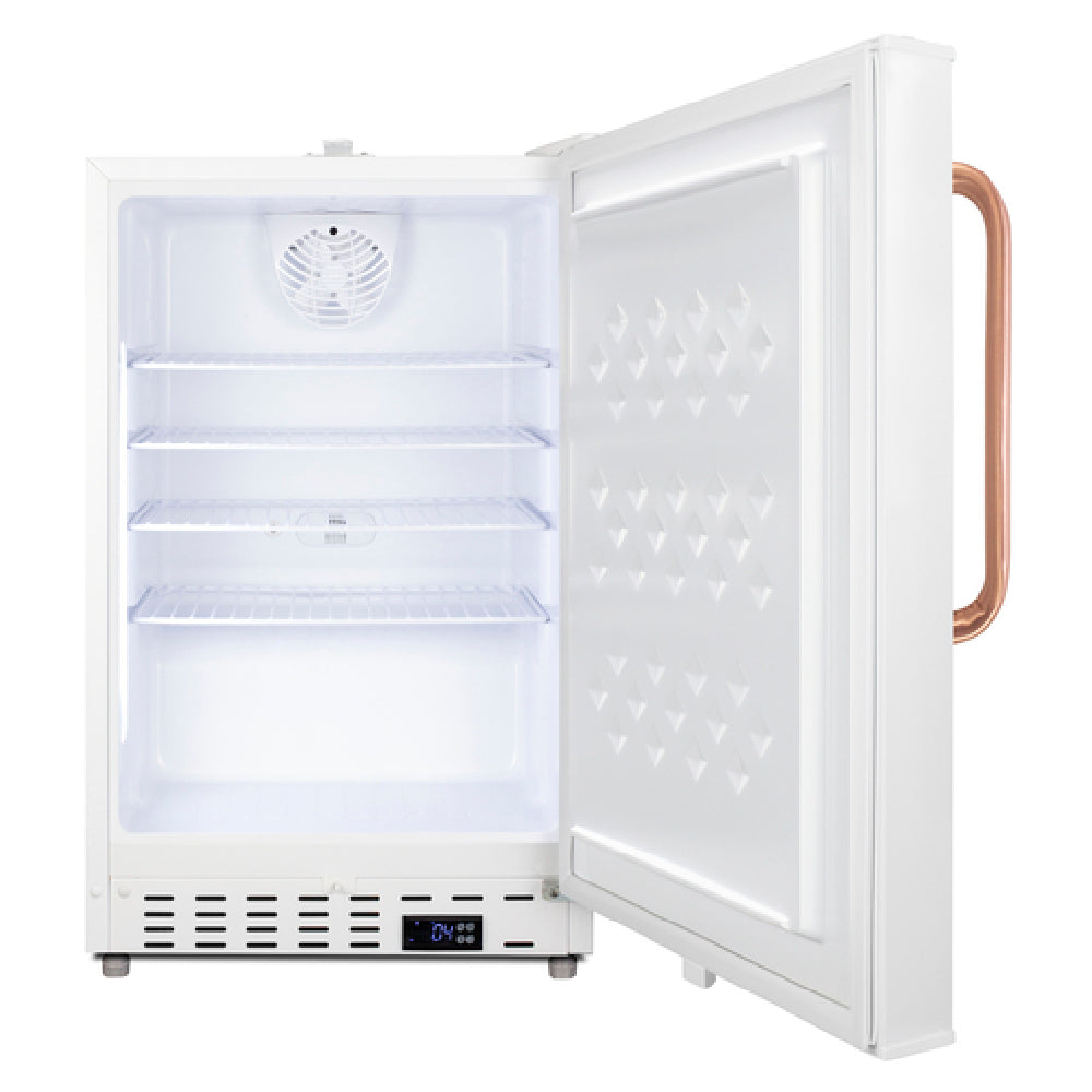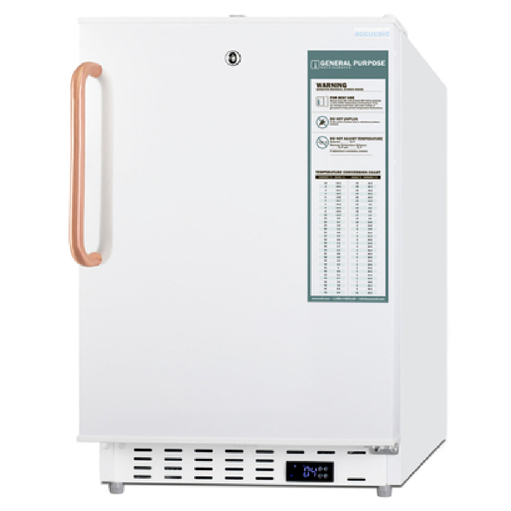 The Summit ADA404REFTBC Accucold Medical Undercounter All-Refrigerator is a versatile refrigeration unit suitable for both built-in or freestanding use, making it an ideal choice for medical facilities requiring flexible installation. With a compact 19-inch width and a spacious 3.32 cubic foot capacity, it efficiently stores medical supplies. Key features include a bottom mount self-contained refrigeration system with advanced R600a Hydrocarbon refrigerant, ensuring eco-friendly and energy-efficient cooling. This refrigerator is equipped with a solid hinged door that locks for secure storage, complemented by an antimicrobial copper towel bar handle for enhanced hygiene. Inside, four wire shelves offer organized storage, illuminated by an LED interior light, while an auto-defrost function and digital thermostat provide convenient operation. A probe hole is included for external monitoring devices, catering to precise temperature management needs. The unit's white interior and exterior, along with level legs, ensure stability and ease of cleaning. Designed to meet ADA compliance and boasting certifications such as cETL, ETL, and ETL-Sanitation, this refrigerator utilizes a hospital-grade cord with a green dot plug for added safety. The Summit ADA404REFTBC provides a reliable and hygienic refrigeration solution for medical environments requiring stringent temperature control and secure storage.