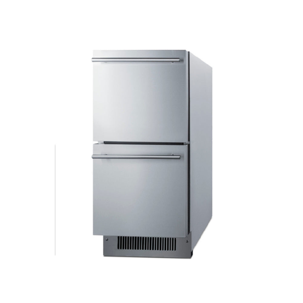 The Summit ADRD15 All-Refrigerator Undercounter Built-in or Freestanding is a versatile refrigeration solution designed for both commercial and residential use. With its compact dimensions of 15 inches in width and 32 inches in height, it fits seamlessly into various spaces, whether built-in or standalone. This refrigerator boasts a capacity of 2.8 cubic feet, providing ample storage across its two drawers, which are equipped with removable sliding chrome baskets for customizable organization. The unit operates within a temperature range of 34 to 43°F, controlled via a digital thermostat for precise climate management. Constructed from 304 stainless steel, it ensures durability and resistance to outdoor and indoor conditions. Energy efficiency is a hallmark, as it utilizes R600a Hydrocarbon refrigerant and operates on a 115v/60Hz electrical system with a minimal draw of 1.0 amps. The refrigerator is designed with an interior and exterior fan system, enhancing temperature uniformity, and features a self-contained bottom-mounted refrigeration unit, promoting easy installation. It includes a Sabbath mode, making it suitable for observant users, and is ADA compliant. Certified by ETL, cETL, and ETL-Sanitation, and recognized as ENERGY STAR (Commercial), the Summit ADRD15 exemplifies reliability and efficiency for diverse refrigeration needs.