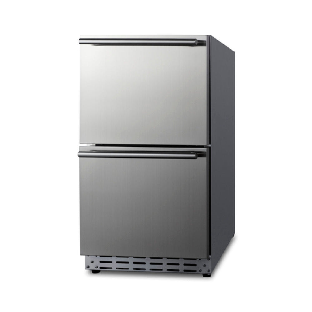 The Summit ADRD18 All-Refrigerator Undercounter Built-in Or Freestanding unit is a versatile refrigeration solution ideal for commercial and residential spaces. Measuring 18"W x 32"H, this refrigerator features a 3.4 cu.ft. capacity, offering ample storage across two drawers. The digital thermostat allows precise temperature control ranging from 34 to 65°F. It comes with removable sliding chrome baskets to facilitate easy access and organization. Constructed of 304 stainless steel, this refrigerator is robust and designed for indoor or outdoor use. It uses an R600a Hydrocarbon refrigerant, making it environmentally friendly and energy-efficient. The unit operates on a 115v/60/1-ph electrical system drawing only 1.25 amps, with a cord and plug included for easy setup. The self-contained bottom-mounted refrigeration system ensures efficient cooling, supported by both interior and exterior fans. The Summit ADRD18 is CARB and ADA compliant, features a Sabbath mode, and is ETL, cETL, and ETL-Sanitation certified. This refrigerator is ideal for both built-in and freestanding installations, catering to diverse market needs while ensuring compliance with health and safety standards.