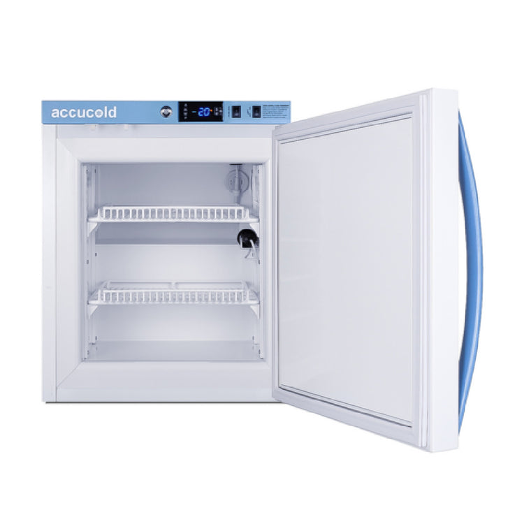 The Summit AFZ1PVMC Breast Milk Freezer is a precision-engineered unit, purpose-built for either built-in or freestanding placement, providing safe and secure storage of breast milk. With a compact width of 18.5 inches and a storage capacity of 1.4 cubic feet, it accommodates the specific needs of various healthcare environments. This freezer maintains a temperature range of -18 to -4°F, with a minimal variation of +/-1°C, ensuring optimal preservation conditions. Its manual defrost system is complemented by two adjustable wire shelves, a reversible and self-closing door with a magnetic gasket, and a white exterior finish. A digital control panel, complete with alarms for high/low temperature, open door, and power failure alerts, enhances monitoring capabilities. The unit features a temperature sensor housed in a glycol-filled bottle and includes a 1/2" probe hole for additional monitoring equipment, alongside remote alarm contacts and password protection for secure operation. Constructed with a white powder-coated metal interior and LED lighting, the Summit AFZ1PVMC includes a factory-installed lock and a hospital-grade cord with a 'green dot' plug. Utilizing an eco-friendly R290a hydrocarbon refrigerant, this CARB-compliant freezer also features an antimicrobial silver ion-coated handle in blue, adhering to high medical standards with ETL and ETL-C certifications.
