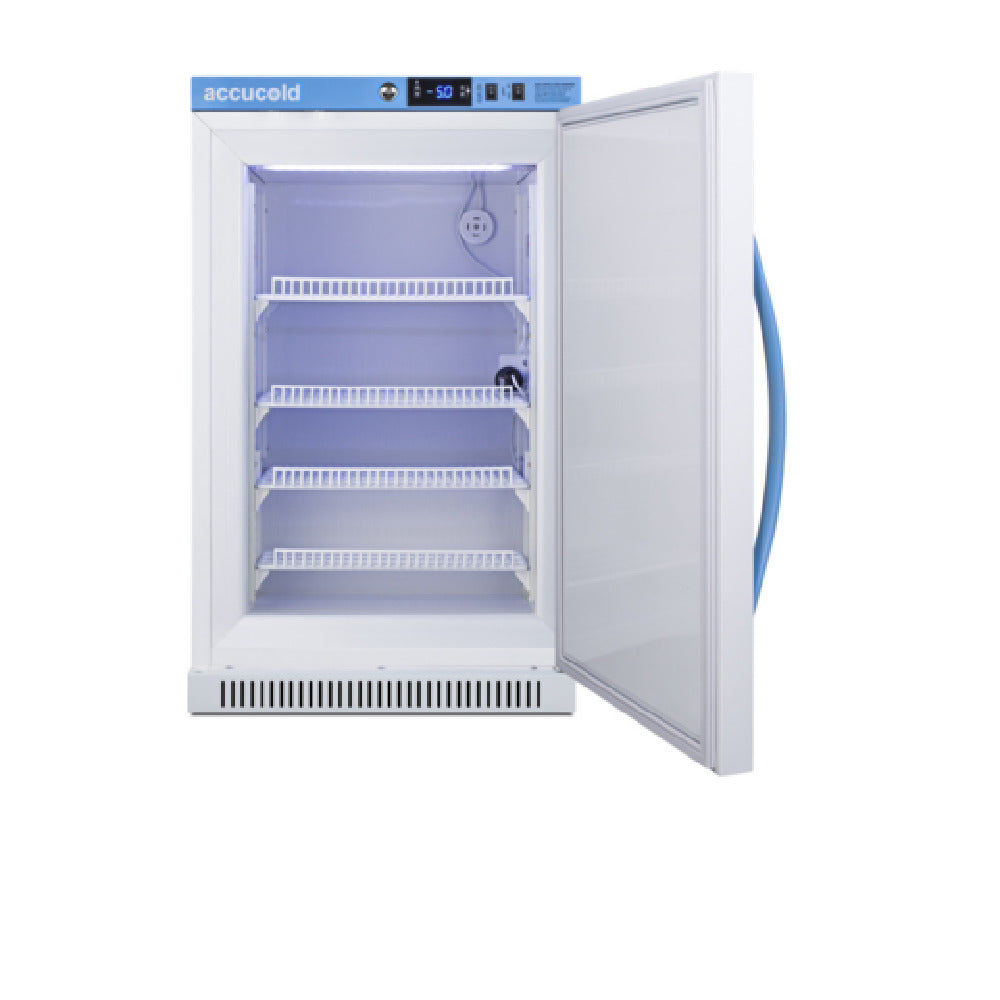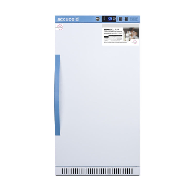 The Summit AFZ2PVBIADAMC Breast Milk Freezer is a meticulously engineered appliance, purposefully designed to accommodate either built-in or freestanding configurations. With its compact 19.75-inch width and a spacious 2.47 cu.ft. capacity, it ensures the safe and secure storage of breast milk. The freezer operates within a temperature range of -18 to -4°F, maintaining precision with a ±1°C variation. It features a manual defrost system and includes four adjustable wire shelves for customizable storage solutions. The reversible door, complemented by a magnetic gasket and self-closing mechanism, enhances usability and energy efficiency. Equipped with a digital control panel, the freezer provides alarms for high/low temperature, open door, and power failures, alongside a temperature sensor housed in a glycol-filled bottle for accurate readings. The design incorporates a 1/2-inch probe hole for supplementary monitoring equipment and remote alarm contacts with password protection. The white powder-coated metal interior, LED lighting, and factory-installed lock further ensure a secure and user-friendly experience. The eco-friendly R290a hydrocarbon refrigerant, antimicrobial silver ion-coated handle, and ADA compliance underscore its commitment to safety and environmental responsibility. Certified by ETL and ETL-C for medical use, the Summit Breast Milk Freezer meets the stringent demands of healthcare and residential settings alike.