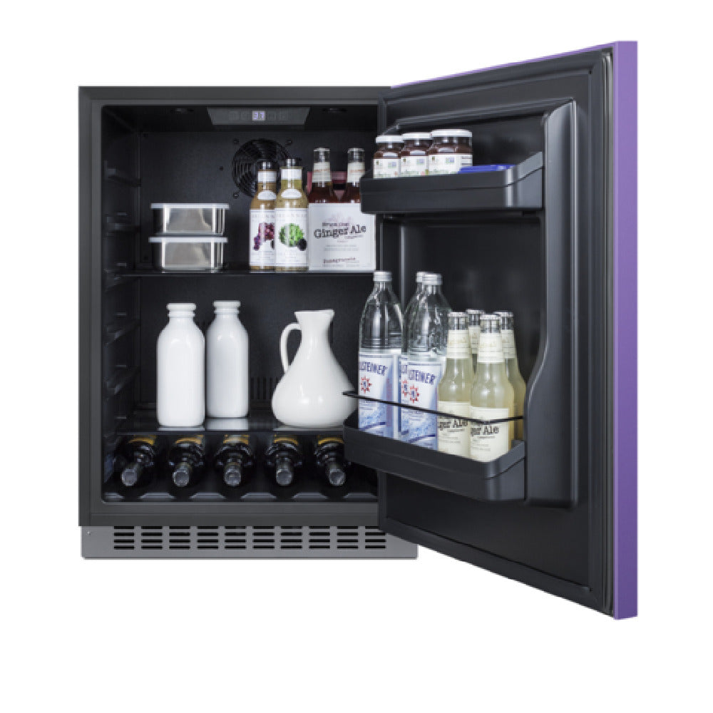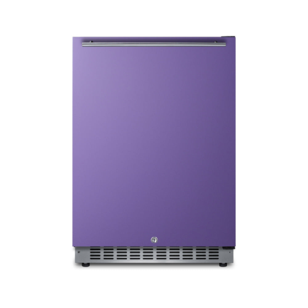 The Summit AL54P Undercounter All-Refrigerator ADA Compliant 23.63"W x 22.63"D x 32"H is a versatile cooling solution, designed with a lavender purple door that adds a splash of color to any commercial or residential setting. This all-refrigerator unit, with its compact dimensions, adheres to ADA guidelines, ensuring accessibility. It offers frost-free operation, making it suitable for both built-in or freestanding applications. The reversible door enhances flexibility in placement, and the fully finished black cabinet, accented by a stainless steel kickplate and horizontally mounted handle, adds a sophisticated flair. Security and convenience are prioritized with features like the front lock, (3) adjustable glass shelves, and door storage. The refrigerator is equipped with advanced digital controls, a temperature memory function, and alarms for both open door and temperature fluctuations, ensuring optimal performance and protection for your stored items. Its recessed LED lighting provides excellent interior visibility. Operating at 115V/60 Hz, this unit is certified by ETL and ETL-S for commercial use, making it a reliable choice for a variety of settings, from office break rooms to hospitality venues, where space and style are equally important. Its thoughtful design caters to diverse market segments, emphasizing accessibility and efficiency.