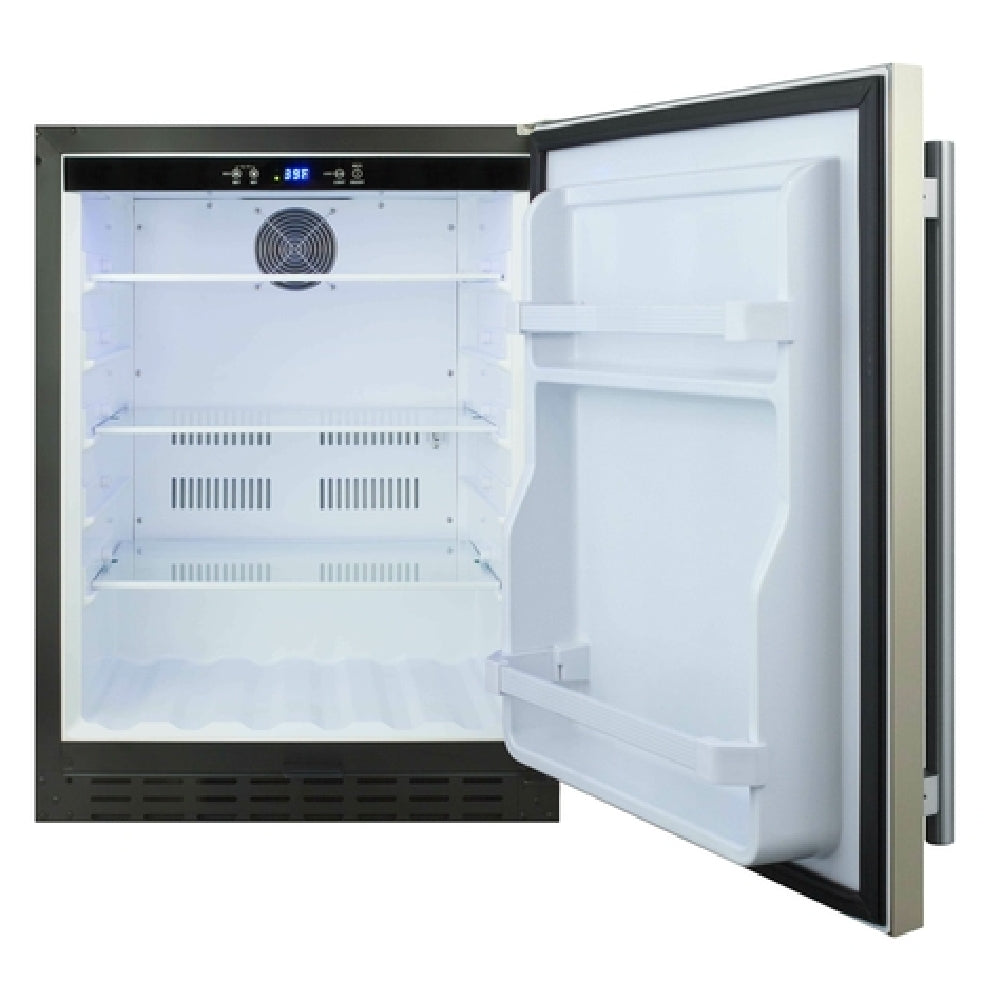 The Summit AL55 All-Refrigerator Undercounter Built-in Or Freestanding model is a versatile refrigeration solution designed for both commercial and residential settings. With a compact width of 23-1/2 inches and a capacity of 4.2 cubic feet, it provides ample storage while fitting seamlessly into various spaces. This model features a solid hinged stainless steel reversible door equipped with a lock, ensuring security and flexibility in door orientation. The pro style vertical handle adds a touch of elegance, while the dimmable LED lighting enhances visibility and ambiance. Inside, the refrigerator is equipped with three adjustable glass shelves and door storage, offering customizable organization options. The unit boasts an automatic defrost function and a digital thermostat for precise temperature control, complemented by a fan-cooled compressor for efficient operation. Additional features include temperature and open drawer alarms, a sealed back, and four leveling feet for stability. The self-contained bottom-mounted refrigeration system uses R600a Hydrocarbon refrigerant, operating at 115v/60/1-ph with a 1.0-amp draw. It comes with a cord and plug, and includes a Sabbath mode for energy conservation. ADA compliant, and certified by ETL, cETL, and ETL-Sanitation, this refrigerator is suitable for a range of industry applications.
