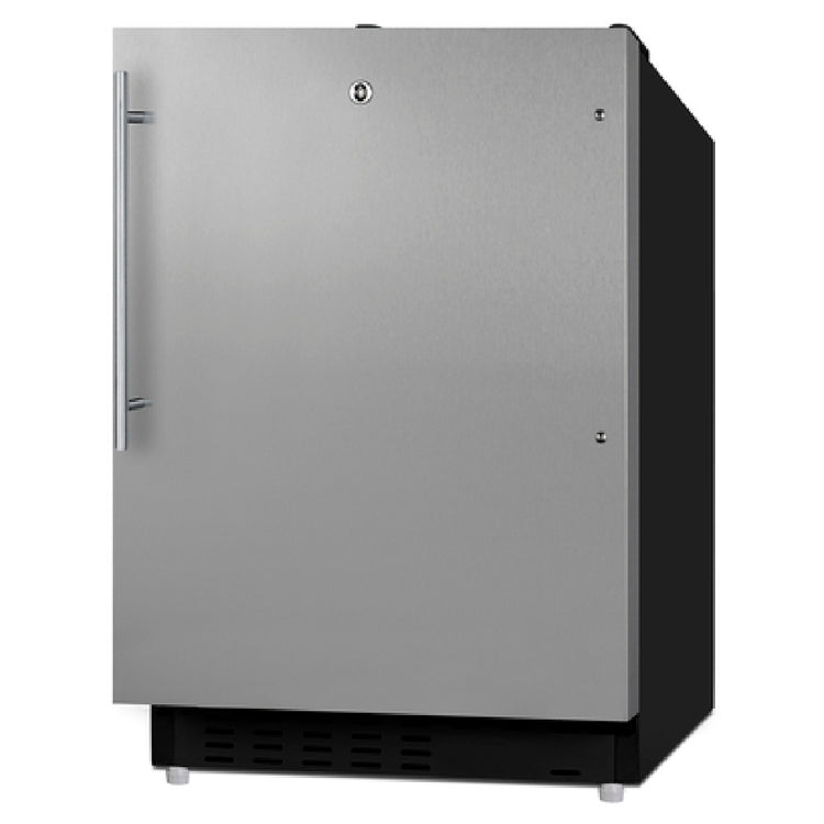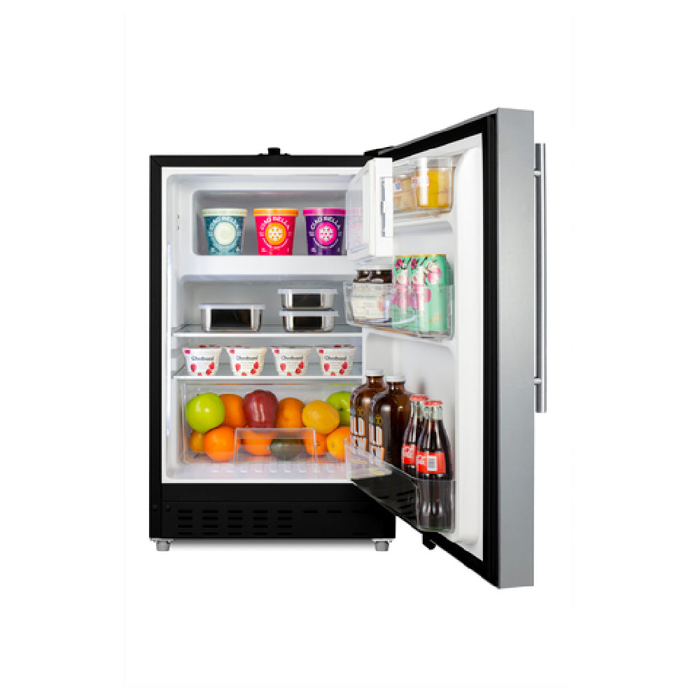 The Summit ALRF49BSSHV Undercounter Refrigerator-Freezer Reach-in One-section is a versatile appliance designed to meet the diverse needs of commercial and residential settings. With dimensions of 19.88"W x 24"D x 32"H, this compact unit offers a 2.68 cu. ft. capacity, making it an excellent choice for locations with limited space. Featuring a reversible solid hinged door with a locking mechanism, the refrigerator ensures secure storage. The pro-style handle adds a touch of sophistication, while the three adjustable glass shelves and a crisper provide customizable storage solutions. Additionally, the removable door racks enhance organizational flexibility. Its manual defrost system and dial thermostat allow for precise temperature control. Constructed with a stainless steel front and black sides, the unit combines durability with an elegant design. The bottom mount self-contained refrigeration system utilizes R600a Hydrocarbon refrigerant, ensuring environmental efficiency. Level legs offer stability on uneven surfaces, and the unit operates at 115v/60/1-ph, drawing just 1.1 amps. Certified by ETL and cETL, this appliance is also ADA Compliant for residential use, making it a reliable and accessible choice for a broad range of applications. Whether built-in or freestanding, the Summit ALRF49BSSHV stands out for its multifunctional capabilities and compact design.