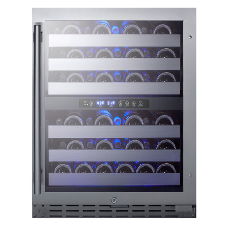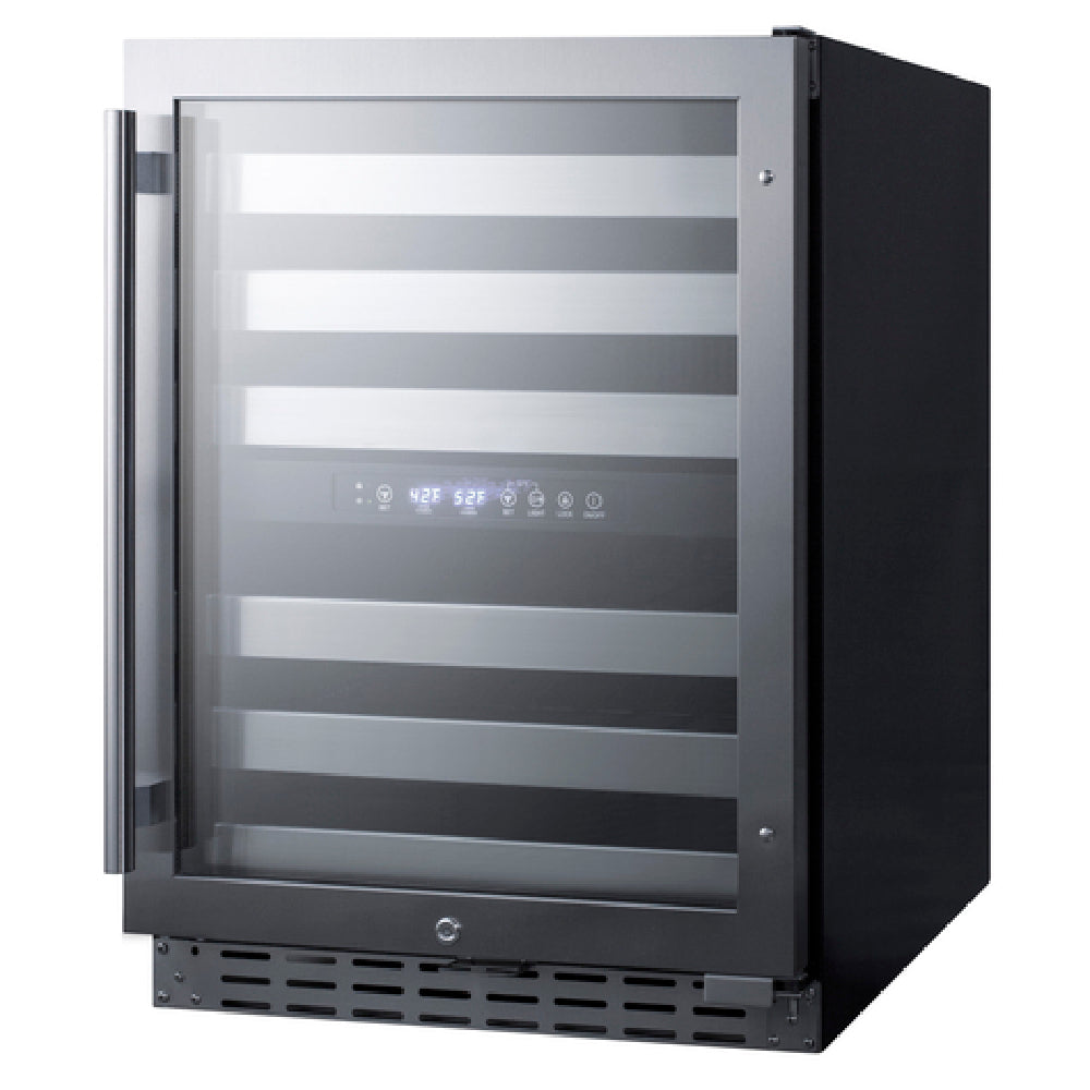 The Summit ALWC532 Wine Cellar Reach-in One-section is a versatile and high-capacity wine storage solution, accommodating up to 46 bottles. This unit is designed for both built-in and freestanding installations, offering flexibility for various professional settings. Measuring at 23-1/2 inches wide, it features dual temperature zones, with the lower zone ranged from 50°F to 64°F and the upper zone from 41°F to 50°F, allowing for precise temperature control suitable for different types of wines. The wine cellar is equipped with a glass hinged stainless steel framed reversible door, providing ease of access and a sleek appearance. Inside, LED lighting elegantly illuminates the six black wire shelves, which are trimmed in stainless steel for enhanced durability and aesthetic appeal. The Summit ALWC532 ensures optimal performance with its automatic defrost function, dual digital thermostats, and fan-cooled compressor. Its self-contained bottom-mounted refrigeration system uses R600a Hydrocarbon refrigerant, making it environmentally conscious. The unit operates at 115v/60/1-ph with a current draw of 1.25 amps. Meeting ADA compliance, cETL, cETLus, and ETL-Sanitation standards, this wine cellar is a reliable choice for commercial applications, providing a blend of functionality and modern design for various industry needs.