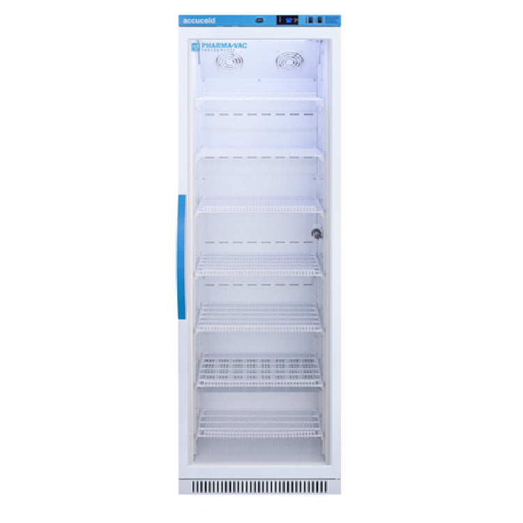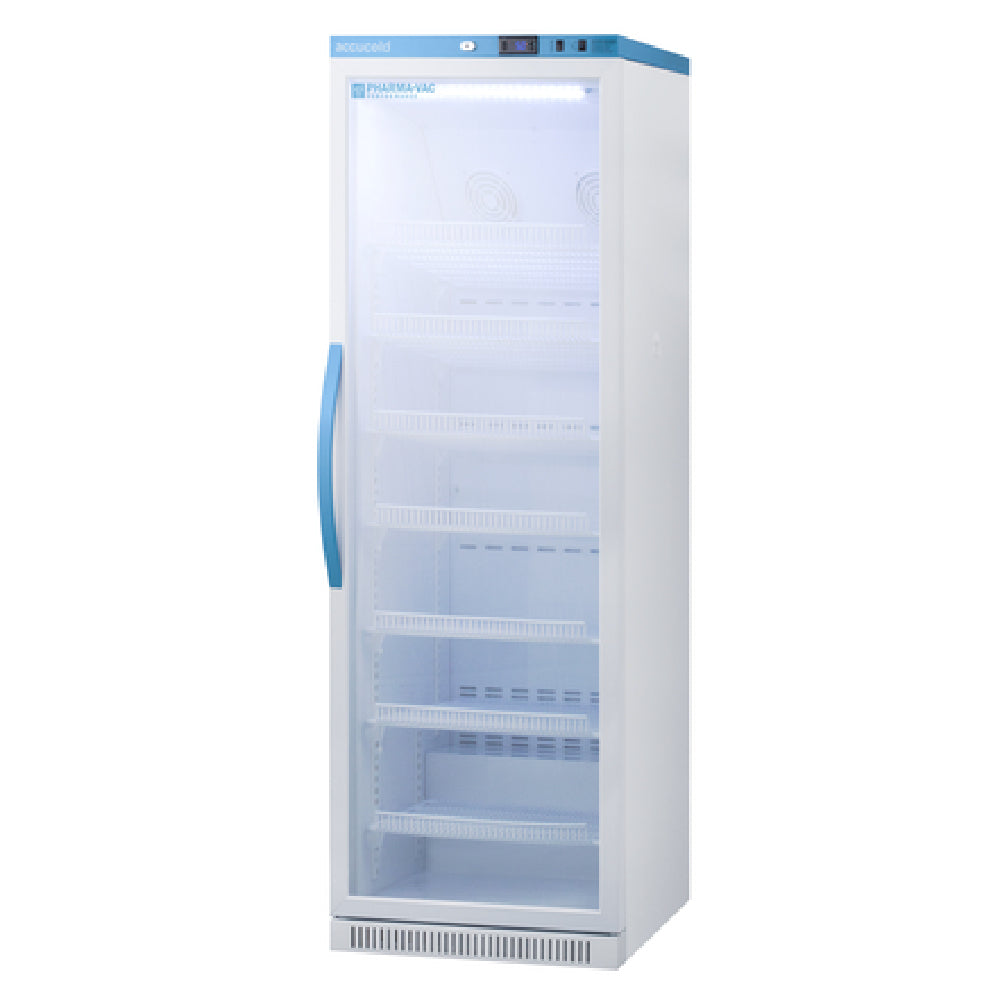 The Summit ARG15PV Accucold Pharma-Vac Series Medical Refrigerator Reach-in One-section stands at 72 inches tall and offers a 15 cubic feet storage capacity, making it an essential choice for medical facilities requiring precise temperature control. This refrigerator features a reversible right-hinged glass door, enhancing accessibility and visibility. It is equipped with seven adjustable wire shelves, providing customizable storage solutions. The unit is designed for optimal safety with open door, temperature, and power failure alarms, ensuring the integrity of sensitive medical supplies. The digital thermostat maintains a temperature range of +2°C to +8°C, crucial for pharmaceutical storage. Its automatic defrost system with adjustable cycle defrost and an interior fan ensures consistent performance and efficiency. The refrigerator incorporates a probe hole and external remote alarm contacts for seamless integration with monitoring systems. Crafted with a white interior and exterior, this unit uses R600a Hydrocarbon refrigerant, aligning with environmentally conscious practices. Operating at 115v/60/1-ph and drawing 1.4 amps, it is cETLus certified for commercial use. The Summit ARG15PV Accucold Pharma-Vac Series Medical Refrigerator is a technologically advanced solution that meets the demanding standards of the medical and pharmaceutical industries, providing reliability and functionality.