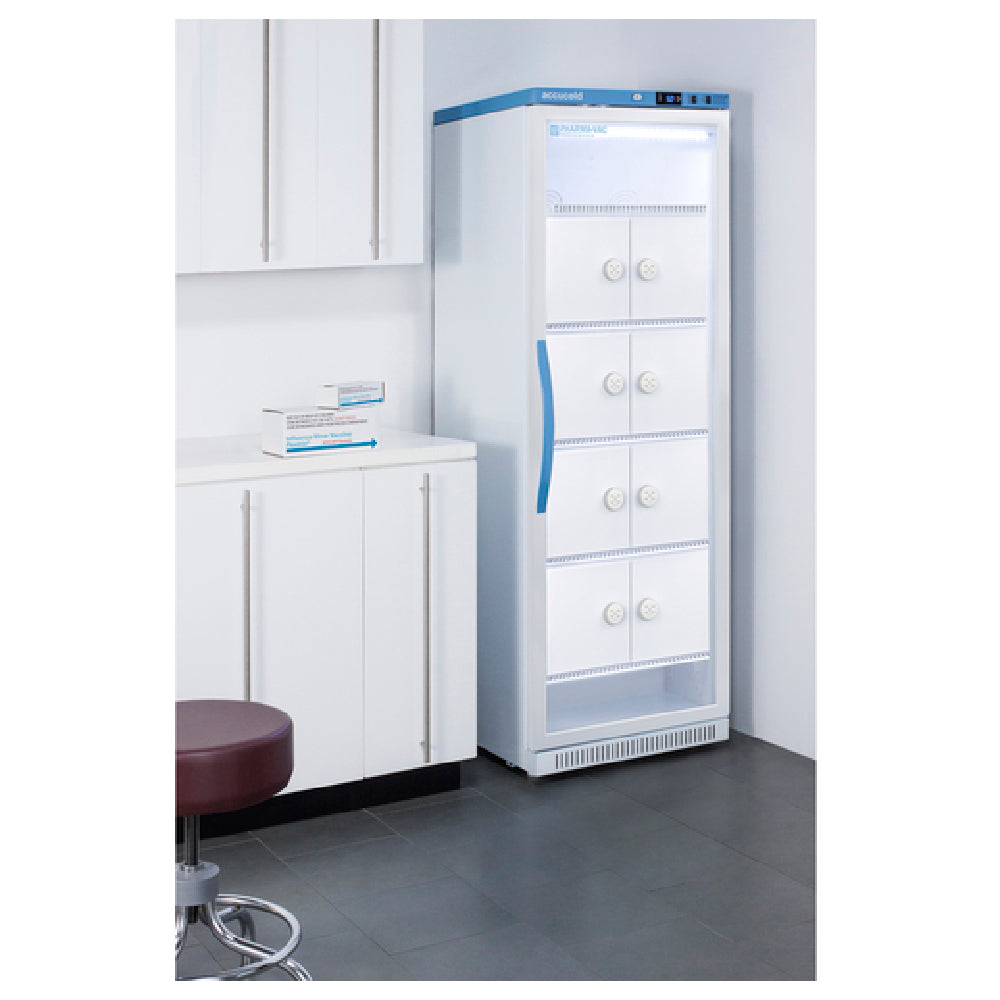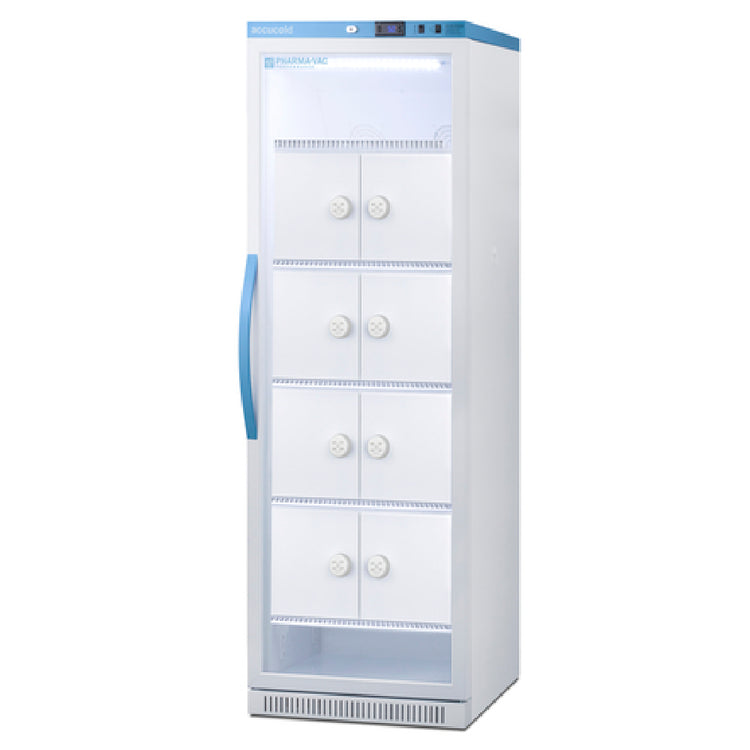 The Summit ARG15PVLOCKER Accucold Pharma-Vac Upright Medical All-Refrigerator is a state-of-the-art solution for medical facilities requiring precise and reliable refrigeration. With a spacious 15 cu. ft. capacity, it caters to various storage needs while maintaining a strict 2°-8°C temperature range, essential for pharmaceutical preservation. The microprocessor digital controls provide accurate temperature management, complemented by an adjustable automatic defrost feature that ensures optimal operation. It boasts eight interior locking compartments, each equipped with combination locks and key overrides for enhanced security. LED lighting and a reversible right-hand swing locking glass door with a white cabinet exterior add to its functional design. For added safety, it includes remote alarm contacts, a temperature alarm, and an open-door alarm. The interior fan ensures even temperature distribution, while the access port offers convenient connectivity for monitoring devices. Utilizing the eco-friendly R600a Hydrocarbon refrigerant, this refrigerator operates efficiently on 115v/60/1-ph and draws only 1.4 amps. Certified by cETLus for medical applications, the Summit ARG15PVLOCKER is an indispensable asset across various segments within the healthcare industry, providing the reliability and precision necessary for the safe storage of sensitive medical materials.