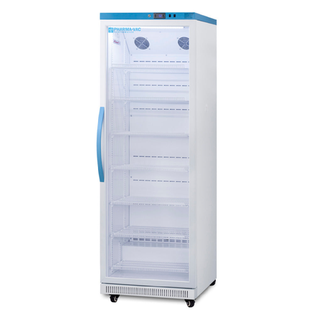 The Summit ARG18PV Accucold Pharmaceutical Refrigerator One-section Freestanding is designed to meet the rigorous storage requirements of pharmaceutical environments, providing a reliable temperature range from +2°C to +8°C. This 18 cu. ft. capacity unit is a freestanding model with a width of 27-1/2", making it versatile for various space configurations. Equipped with an automatic defrost system, it ensures minimal maintenance and efficient operation. The refrigerator features a field reversible self-closing glass door with a lock, enhancing security and accessibility. Inside, six wire shelves offer flexible storage options, complemented by LED lighting for clear visibility of contents. The digital thermostat allows precise temperature control, while an open door alarm ensures product safety by alerting for any breaches. The interior fan aids in consistent temperature distribution throughout the unit. Constructed with a white exterior and interior, the refrigerator's design is both functional and aesthetically pleasing. It utilizes a bottom mount self-contained refrigeration system powered by R290a Hydrocarbon refrigerant, known for its environmentally friendly properties. Operating at 115v/60/1-ph with 1.5 amps, the unit is ETL and cETL certified, emphasizing its compliance with commercial safety standards. This refrigerator is an essential asset for pharmacies and medical facilities requiring dependable and efficient pharmaceutical storage solutions.