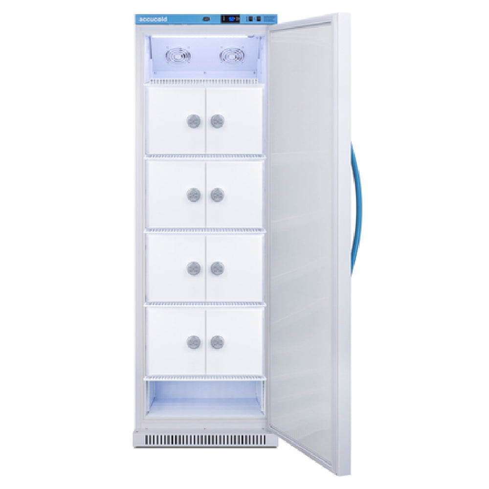 The Summit ARS15PVLOCKER Accucold Pharma-Vac Upright Medical All-Refrigerator is engineered with a spacious 15 cu. ft. capacity, tailored to meet the stringent demands of medical facilities. The unit maintains precision with microprocessor digital controls, ensuring its temperature range of 2°-8°C is consistently upheld. It offers adjustable automatic defrost capabilities, contributing to hassle-free maintenance. Security is paramount with its (8) interior locking compartments, each equipped with combination locks and key override, safeguarding sensitive contents. LED lighting enhances visibility inside the refrigerator, while remote alarm contacts and a temperature alarm provide critical alerts. The open door alarm further ensures the integrity of stored items. This model is designed with a reversible right-hand swing solid door, and a white cabinet finish, making it adaptable to various healthcare settings. An interior fan promotes uniform cooling, utilizing R600a Hydrocarbon refrigerant, which is eco-friendly and efficient. Operating at 115v/60/1-ph and drawing 1.4 amps, it is cETLus certified for medical use, reflecting its compliance with safety standards. The Summit ARS15PVLOCKER is a robust solution for clinics, pharmacies, and laboratories, offering a blend of security, efficiency, and reliability.