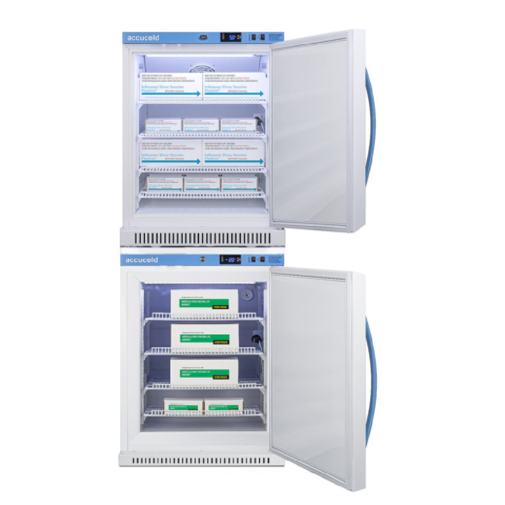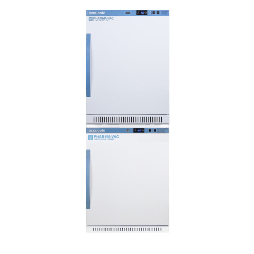 The Summit ARS6PV-AFZ5PVBIADASTACK Performance Series All-Refrigerator/All-Freezer Combination is a purpose-built unit designed for the precise storage of pharmacy, medication, and vaccines. This freestanding appliance boasts a 9.88 cu.ft capacity, featuring a solid door refrigerator and freezer. Its antimicrobial silver ion-coated handle in blue enhances hygiene, crucial for medical environments. The refrigerator maintains temperatures between 2 - 8°C, while the freezer operates from -30 to -10°C, with a precision of +/-1°C. A digital control panel manages functions, incorporating alarms for high/low temperature, open door, and power failure alerts, supported by a temperature sensor in a glycol-filled bottle. For enhanced monitoring, it includes a 1/2" probe hole and remote alarm contacts. Users can secure settings with password protection and view temperatures in either °C or °F. The interior, finished in white powder-coated metal with LED lighting, ensures visibility and durability. Additional features include a factory-installed lock and a hospital-grade cord with a 'green dot' plug. The eco-friendly design uses R600a hydrocarbon refrigerant, compliant with CARB standards. Delivery includes three boxes for customer assembly, with the StackRack positioned at the base. The unit is ETL, ETL-C (Medical) certified, emphasizing its suitability for professional healthcare settings.