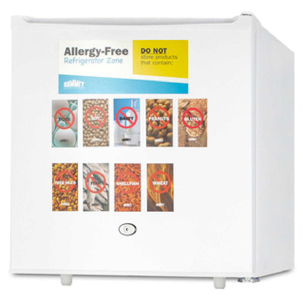 The Summit AZAR2W Compact All-Refrigerator Built-in Or Freestanding One-section is a versatile refrigeration solution tailored for commercial settings, measuring 18-3/4 inches in width with a capacity of 1.7 cubic feet. This unit features a rear mount self-contained refrigeration system and uses R600a Hydrocarbon refrigerant, ensuring efficient and environmentally friendly operation. It is equipped with a solid hinged locking door for security, and the interior includes a wire shelf to organize storage. The refrigerator offers an auto-defrost function and utilizes a dial thermostat for precise temperature control. With LED lighting, the interior is well-illuminated, enhancing visibility of stored items. Additional accessories include nine allergy warning magnets, catering to health-conscious environments. The white finish of both the interior and exterior provides a clean, professional appearance, complemented by leveling legs for stability on uneven surfaces. Operating on 115 volts, 60 Hz, 1 phase, and drawing 1.0 amp, it comes with a cord and plug for straightforward installation. Certified by ETL and cETL, this refrigerator ensures adherence to commercial safety and quality standards. Its design allows it to function as either a built-in or freestanding unit, meeting diverse needs across various business segments while maintaining compactness and efficiency.