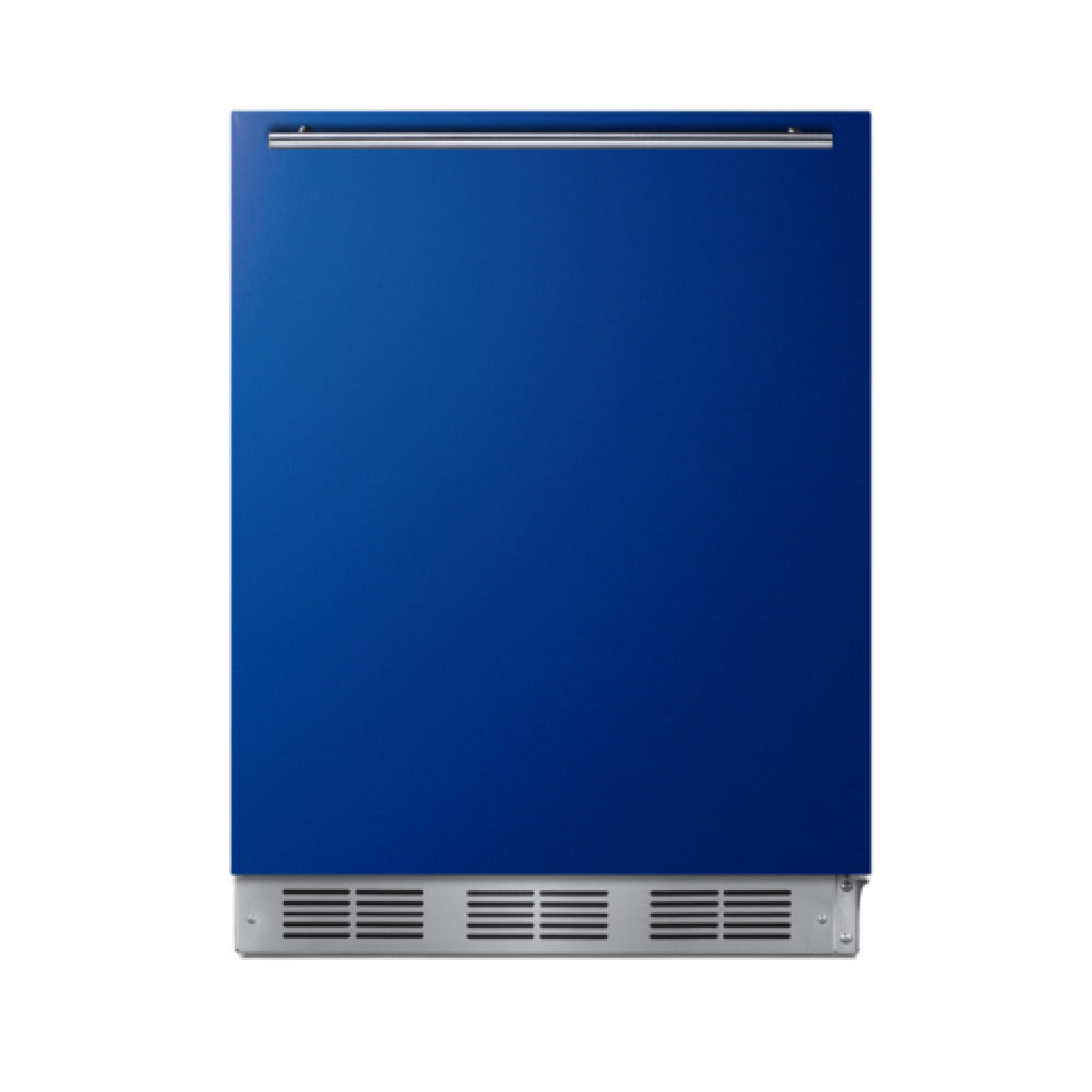 The Summit BRF611WHBADA Undercounter Refrigerator-Freezer is a versatile solution designed for both commercial and residential settings, offering a 5.1 cu.ft. capacity that optimizes storage in tight spaces. This unit measures 23.63"W x 23"D x 32.13"H, making it adaptable for undercounter installation while being ADA compliant with a 32" height. The refrigerator-freezer features a cobalt blue door complemented by a white exterior cabinet and a horizontally mounted stainless steel handle, providing a modern aesthetic. Its design includes a reversible door for flexible placement, accommodating various kitchen layouts. Inside, users will find two adjustable glass shelves, three door shelves, a dedicated wine shelf, and a crisper drawer for organized storage. It operates with a dial thermostat, an interior light, and a frost-free refrigerator alongside a manual defrost freezer. Engineered for eco-friendliness, it utilizes R600a refrigerant and meets CARB compliance. The appliance operates on 115V/60 Hz power and holds ETL and ETL-C certifications for residential use. This undercounter refrigerator-freezer can be installed as either built-in or freestanding, making it suitable for a range of market segments, from hospitality to personal home kitchens, due to its compact and efficient design.