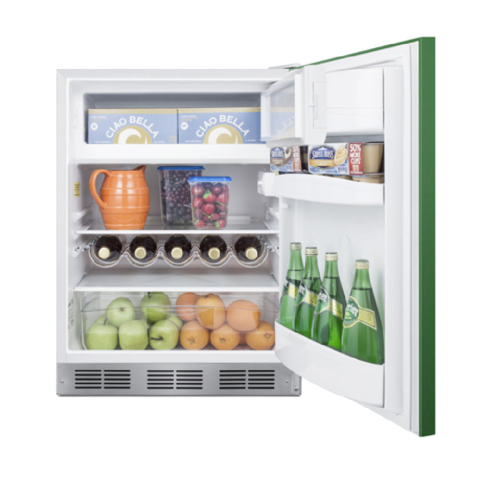The Summit BRF611WHGADA Undercounter Refrigerator-Freezer is a versatile unit designed for commercial and residential use with a capacity of 5.1 cu.ft. Measuring 23.63"W x 23"D x 32.13"H, it is equipped with an emerald green door that can enhance any space, whether built-in or freestanding. This model is ADA compliant with a 32" height, ensuring accessibility for all users. The door is reversible, providing flexibility in placement, and features a horizontally mounted stainless steel handle for a sleek appearance. Its white exterior cabinet houses (2) adjustable glass shelves, (3) door shelves, a wine shelf, and a crisper drawer, catering to a variety of storage needs. The refrigerator operates frost-free, while the freezer requires manual defrost. A dial thermostat allows for easy temperature adjustments, and an interior light aids visibility. Environmentally friendly, it uses R600a refrigerant and is CARB compliant. Operating on 115V/60 Hz, it meets ETL and ETL-C (Residential) certifications. This refrigerator-freezer is ideal for hospitality, healthcare, and office environments, offering a compact and efficient cooling solution that meets stringent environmental and accessibility standards.