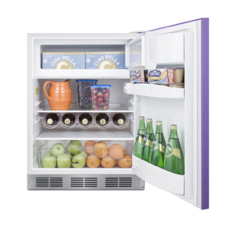 The Summit BRF611WHP Undercounter Refrigerator-Freezer is a versatile appliance with a 5.1 cu.ft. capacity, designed to meet the needs of both residential and commercial environments. Measuring 23.63"W x 23"D x 32.63"H, this unit can be used as a built-in or freestanding model, offering flexibility in installation. The refrigerator-freezer features a striking lavender purple door, complemented by a white exterior cabinet and a horizontally mounted stainless steel handle. It boasts a reversible door for added convenience. Inside, the refrigerator compartment includes two adjustable glass shelves, three door shelves, a wine shelf, and a crisper drawer, providing ample storage options. The frost-free operation ensures efficient cooling in the refrigerator section, while the freezer requires manual defrosting. Equipped with a dial thermostat and interior light, it offers user-friendly temperature control and visibility. The unit utilizes R600a refrigerant and operates on 115V/60 Hz, ensuring energy-efficient performance. It is CARB compliant and meets ETL and ETL-C standards for residential use. The Summit BRF611WHP stands out with its combination of functional design, stylish aesthetics, and reliable performance, making it an ideal choice for diverse market segments, including compact residential spaces and hospitality environments.