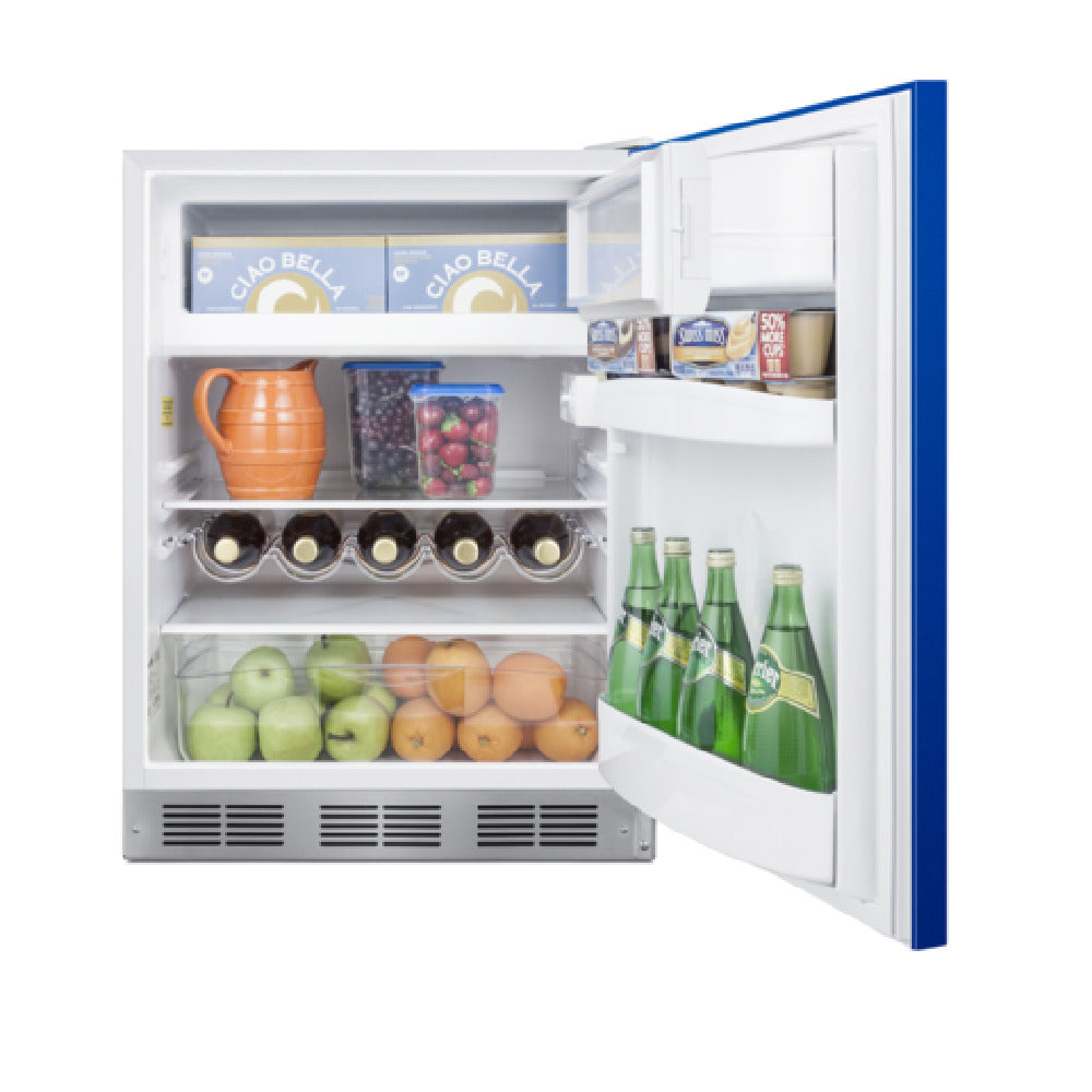 The Summit BRF631BKB Undercounter Refrigerator-Freezer is a versatile and compact refrigeration solution, boasting a 5.1 cu.ft. capacity and dimensions of 23.63"W x 23"D x 32.63"H. This product is designed to fit seamlessly into both built-in and freestanding applications, making it a flexible choice for various settings. Its cobalt blue door and jet black exterior cabinet provide a sleek aesthetic, enhanced by a horizontally mounted stainless steel handle. The unit offers a reversible door for adaptable installation and includes a factory-installed lock for added security. Inside, it features two adjustable glass shelves, three door shelves, a crisper drawer, and a wine shelf, allowing for organized storage. The refrigerator section operates with frost-free technology, while the freezer requires manual defrosting. The dial thermostat facilitates easy temperature adjustments, and an interior light ensures visibility. The Summit BRF631BKB uses R600a refrigerant, is CARB compliant, and operates on 115V/60 Hz. Certified with ETL and ETL-C for residential use, this refrigerator-freezer is an efficient and reliable choice for both commercial and residential environments, offering a blend of style, functionality, and eco-conscious design.