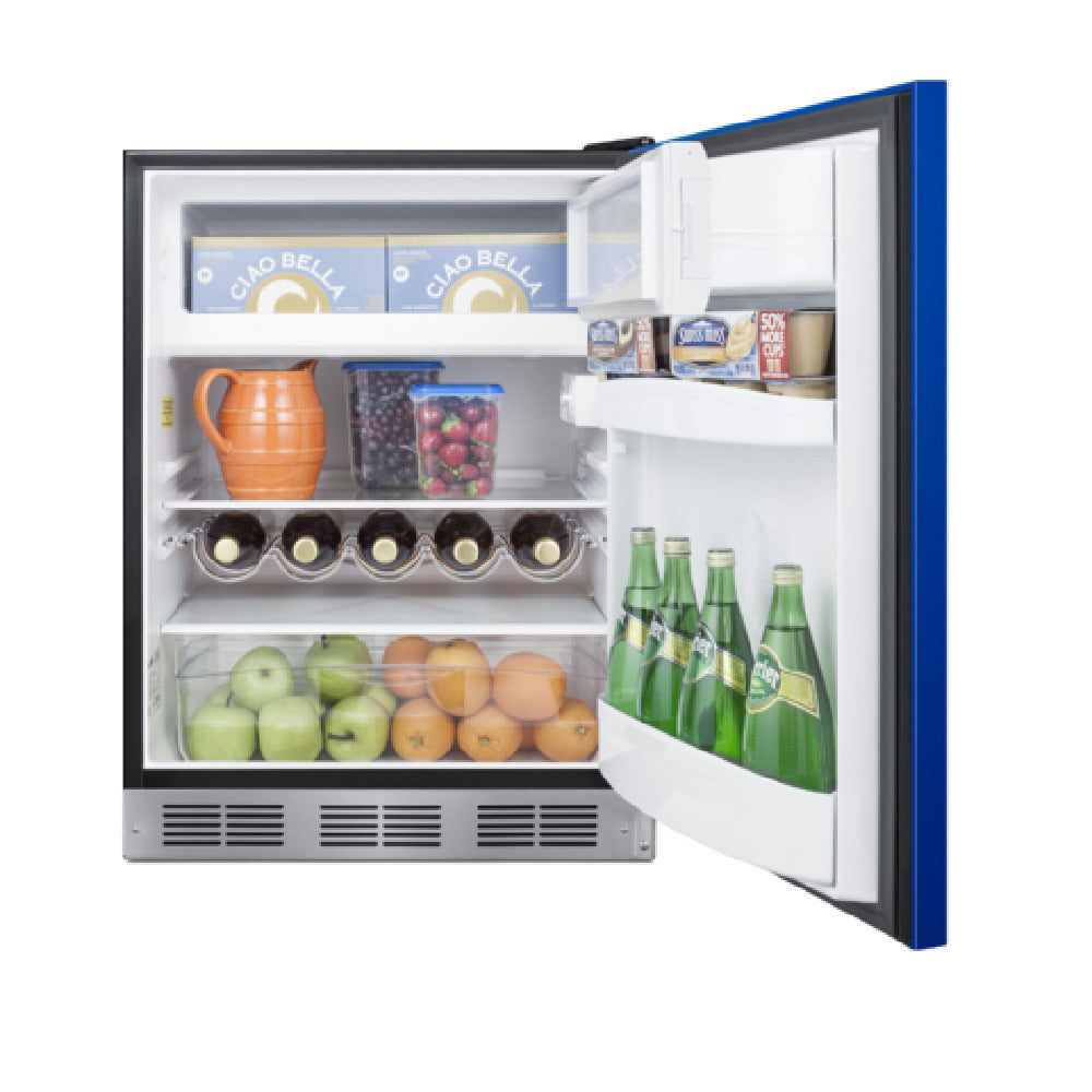 The Summit BRF631BKBADA Undercounter Refrigerator-Freezer is a versatile and efficient unit with a 5.1 cu.ft. capacity, measuring 23.63"W x 23"D x 32.13"H. This compact appliance features a cobalt blue door that can be built-in or used freestanding, and it complies with ADA height standards of 32 inches. The refrigerator-freezer is equipped with a reversible door and a factory-installed lock for added security. It boasts a horizontally mounted stainless steel handle and a sleek jet black exterior cabinet. Inside, the refrigerator includes two adjustable glass shelves, three door shelves, a crisper drawer, and a dedicated wine shelf for optimal storage flexibility. The unit utilizes a dial thermostat and an interior light to ensure user-friendly operation. The refrigerator operates frost-free, while the freezer requires manual defrosting. Environmentally friendly, this appliance uses R600a refrigerant and meets CARB compliance standards. Powered by a 115V/60 Hz energy source, the BRF631BKBADA is ETL and ETL-C certified for residential use. This undercounter refrigerator-freezer is ideal for residential and commercial settings, offering a combination of practical design and reliable performance.