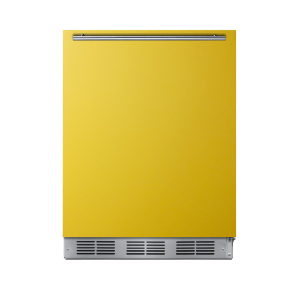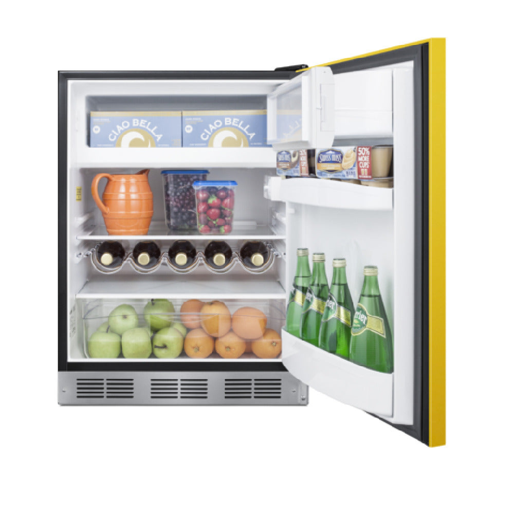 The Summit BRF631BKY Undercounter Refrigerator-Freezer is a versatile appliance with a 5.1 cu.ft. capacity, designed to cater to various storage needs in both residential and commercial settings. With dimensions of 23.63"W x 23"D x 32.63"H, it fits seamlessly under countertops while providing ample storage. The refrigerator-freezer features a striking saffron gold door, complemented by a jet black exterior cabinet, making it a stylish addition to any kitchen or workspace. Its reversible door allows for flexible installation options, whether built-in or freestanding, and the horizontally mounted stainless steel handle adds a touch of elegance. For secure storage, the unit includes a factory-installed lock. Inside, it boasts two adjustable glass shelves, three door shelves, a crisper drawer, and a dedicated wine shelf. The refrigerator section operates frost-free, while the freezer requires manual defrosting, providing user control over defrost cycles. A dial thermostat ensures precise temperature management, and an interior light enhances visibility. This model uses R600a refrigerant, is CARB compliant, and operates on 115V/60 Hz. Certified by ETL and ETL-C for residential use, the Summit BRF631BKY is a reliable and efficient solution for those seeking a compact yet high-performing refrigeration option.
