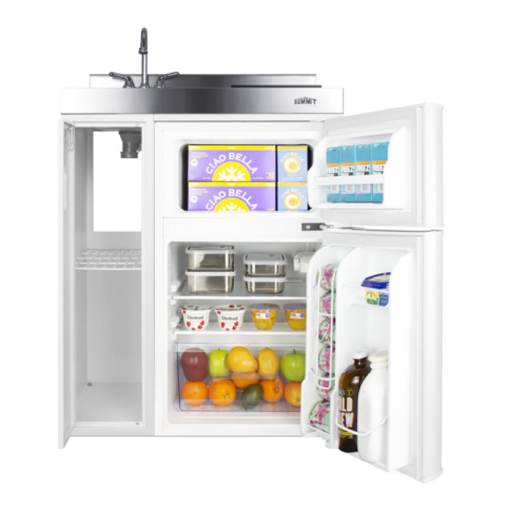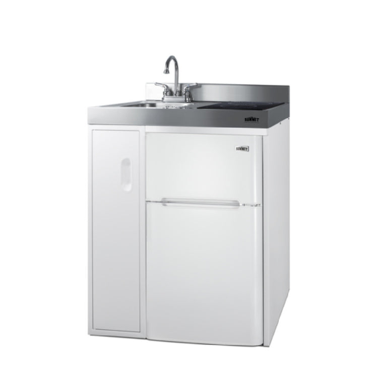 Summit Commercial, C30IND, All-in-one kitchenette, 30" wide, includes pre-installed 115V 2-burner induction cooktop, indicator lights (cooktop), compact cycle defrost 2-door refrigeror-freezer (ENERGY STAR-Certified), one piece stainless steel countertop, stainless steel backguard, white metal cabinet, sink with faucet, storage compartment, ships fully assembled in one box, 115V/60 Hz, 100% CFC Free, CARB Compliant, ETL, ETL-C (Residential)