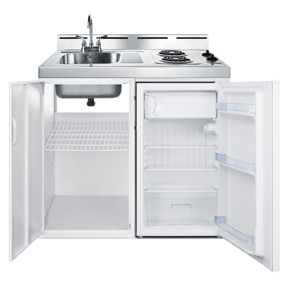 The Summit C39EL All-in-One Combo Kitchen is a versatile unit designed to maximize efficiency and functionality in compact spaces. Measuring 39 inches in width, 24 inches in depth, and 40 inches in height, it features a one-piece stainless steel top equipped with a built-in sink and faucet. This kitchen combo includes a two-burner electric coil cooktop operating at 12.0 amps, perfectly suited for small-scale cooking needs. Integrated into its design is a 2.93 cu.ft. refrigerator/freezer (CM406W), which utilizes only 0.8 amps, providing an energy-efficient solution for food storage. The unit's lower cabinet comes with an adjustable shelf, adding flexibility to your storage options. With a sleek white exterior and door finish, the product ships conveniently in one box, simplifying the installation process. Operating at 115 volts and drawing a total of 14.0 amps, the Summit C39EL is cETLus certified, ensuring high standards of safety and reliability. This all-in-one kitchen solution is ideal for a variety of environments, from small apartments to office breakrooms, delivering a compact yet comprehensive kitchen experience.