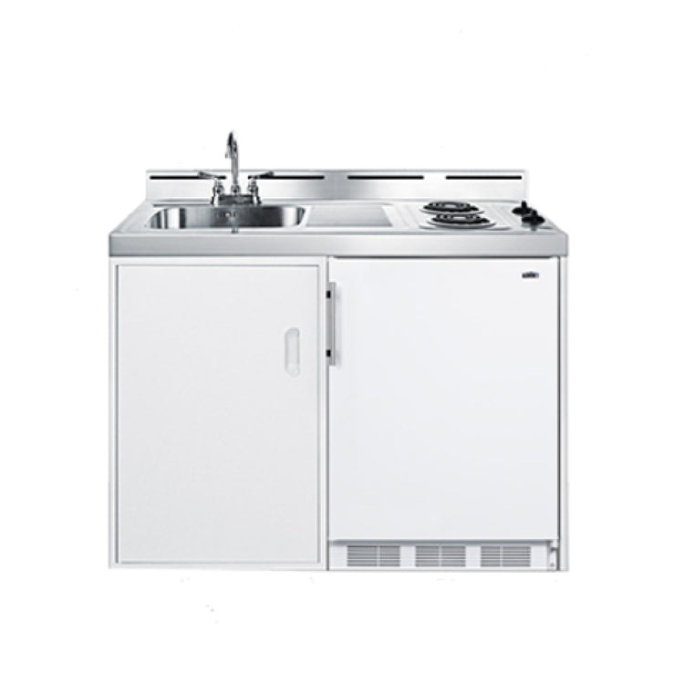 The Summit C48EL All-in-One Combo Kitchen is a versatile solution for compact spaces, measuring 47.25 inches in width, 24 inches in depth, and 40 inches in height. This unit features a seamless one-piece stainless steel top that integrates a deep drawn sink with an accompanying faucet, ensuring both durability and ease of cleaning. It includes a two-burner electric cooktop, providing essential cooking facilities in a small footprint. The ensemble is complemented by a 5.1 cubic foot refrigerator/freezer, equipped with manual defrost, offering ample storage for perishables. Its white exterior and door finish lend a clean, modern aesthetic suitable for various environments, from residential settings to hospitality suites. The product ships in two boxes for ease of handling and installation. Certified by cETL for residential use, the Summit C48EL is an efficient and compact kitchen solution, combining essential kitchen components in a streamlined design. Its thoughtful engineering makes it an ideal choice for diverse market segments seeking to maximize functionality in limited spaces, such as studio apartments, dormitories, or small offices, ensuring that every essential kitchen task can be accomplished with efficiency and style.