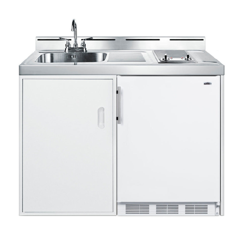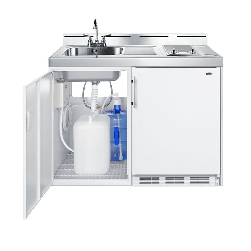 Summit C48ELGLASSPUMP All-in-one Kitchenette - No Plumbing Required - 6 Gallon Waste Container Included is a versatile solution tailored for compact living spaces, catering to diverse market segments seeking convenience and efficiency. This all-in-one kitchenette features a 48-inch wide unit complete with a pre-installed 115V 2-burner smooth-top cooktop, allowing for seamless cooking. The inclusion of a 5 cu.ft. cycle defrost refrigerator-freezer ensures optimal food storage within a confined space. Its easy-to-install 110V pump system, with hardware included, supports two five-gallon water jugs and ships with an empty five-gallon water jug, offering a practical approach to water management without the need for plumbing. The stainless steel work surface paired with a white metal cabinet and stainless steel backguard adds a sleek, modern touch to any environment. Its shallow depth design maximizes space efficiency, making it ideal for urban apartments or office break rooms. The kitchenette operates on 115V/60 Hz and holds ETL (Residential) and ETL-C certifications, underscoring its commitment to safety and quality standards. This product is an excellent choice for those seeking a compact, high-functionality kitchen solution that integrates essential cooking and refrigeration features in one cohesive unit.