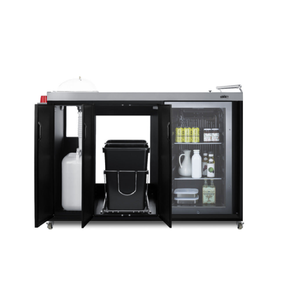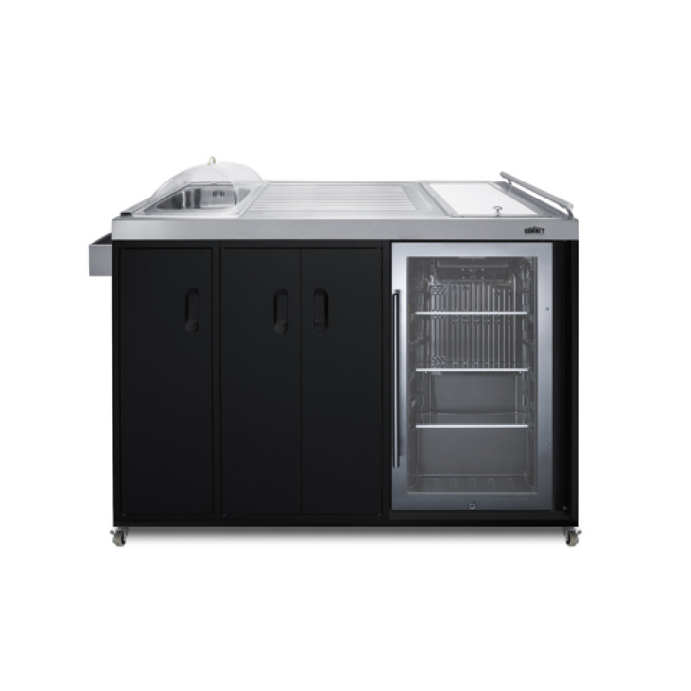 The Summit CARTOS54LG Portable Outdoor Kitchenette With Glass Door Refrigerator 58"W is an innovative solution for outdoor culinary enthusiasts, integrating style and functionality. This compact yet comprehensive unit includes an ADA compliant refrigerator with a capacity of 3.13 cu.ft., featuring six adjustable glass shelves, an adjustable thermostat, and automatic defrost, all illuminated by efficient LED lighting. The refrigerator's black interior finish and factory-installed lock provide both aesthetic appeal and security. A stainless steel handle complements the sleek, black exterior finish. The kitchenette's versatility is enhanced by a one-piece stainless steel countertop and a side speed rail, alongside a storage cabinet and removable cutlery bin for organizational ease. Additionally, a sink with faucet is conveniently located on the left side, supported by a durable stainless steel work surface and backguard. Powered by 115 V AC/60 Hz and utilizing R600a refrigerant, this unit is 100% CFC free, meeting ETL, ETL-S, and ETL-C certifications. Shipped fully assembled in two boxes, the Summit CARTOS54LG embodies a seamless blend of convenience and efficiency, catering to both residential and commercial segments seeking a high-quality, portable outdoor kitchen solution.