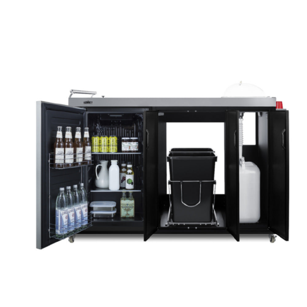 The Summit CARTOS54RS Portable Outdoor Kitchenette With Stainless Steel Door Refrigerator is a versatile solution for outdoor culinary needs, boasting a 58-inch width and designed to cater to varied market segments. This kitchenette includes an ENERGY STAR certified ADA compliant refrigerator with a 3.13 cubic foot capacity, ensuring energy efficiency and accessibility. Featuring three adjustable glass shelves, an adjustable thermostat, and automatic defrost, it offers customizable and convenient cooling solutions. The interior is illuminated with LED lighting and secured with a factory-installed lock, complemented by a sleek black finish. Its storage capabilities are enhanced by a removable cutlery bin and a storage cabinet. The one-piece stainless steel countertop integrates seamlessly with the stainless steel sink and faucet, located on the right side, promoting durability and easy cleaning. A stainless steel speed rail and backguard provide additional functionality and protection. This unit ships fully assembled in two boxes, utilizing 115 V AC/60 Hz and eco-friendly R600a refrigerant, and it is 100% CFC free. Certified by ETL, ETL-S, and ETL-C for residential use, the Summit CARTOS54RS is an exemplary choice for those seeking a robust and efficient outdoor kitchenette solution.