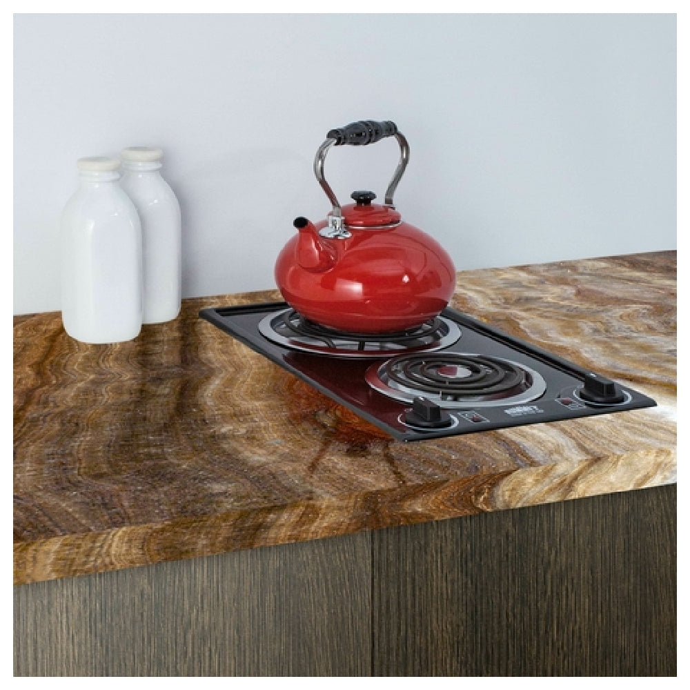 The Summit CCE226BL Radiant Cooktop Electric 12" W is a versatile cooking appliance designed for both residential and commercial use, epitomizing efficiency and reliability. This cooktop features a compact 12-inch width, perfectly suited for kitchens with limited counter space. It includes two burners: a 6-inch 675W coil burner and an 8-inch 950W coil burner, offering flexibility in cooking tasks. The cooktop is constructed with a black porcelain surface, ensuring durability and easy maintenance. It operates on a 230v/60/1-ph electrical system with a 7.0-amp output, making it compatible with standard residential electrical setups. Dial controls provide user-friendly operation, while indicator lights offer safety by signaling when burners are in use. The required cutout dimensions are 11.13"W x 19.13"D x 5"H, facilitating straightforward installation. Equipped with a cord and plug, the Summit CCE226BL is ready for immediate installation. Certified by ETL and cETL, this cooktop meets rigorous safety and quality standards. Proudly made in the USA, it stands out as a dependable choice for different market segments, whether in compact home kitchens or commercial setups requiring efficient, reliable cooking solutions.