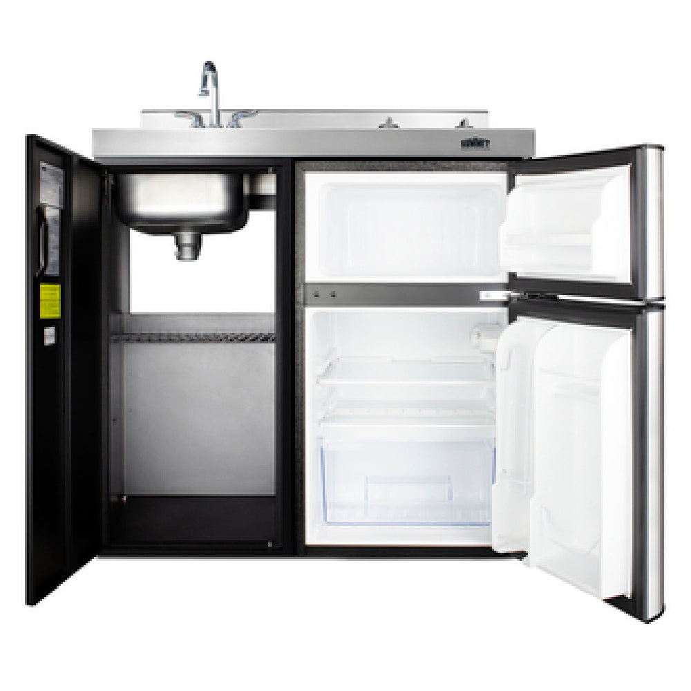 The Summit CK36ELGLASS All-in-One Kitchenette is a compact yet versatile solution for spaces that require efficient kitchen facilities in a limited area. Measuring 36.13 inches in width, 24.63 inches in depth, and 40 inches in height, this unit is expertly designed with a one-piece stainless steel top that incorporates a deep drawn sink and faucet. It features a two-burner glass electric cooktop, providing ample cooking capabilities with a power output of 1.5kW and operates on two 115v/60/1-ph connections, drawing 13.1 amps. To cater to refrigeration needs, it includes a 3.2 cu.ft. refrigerator-freezer with a cycle defrost system, model CP34BSS, ensuring efficient cooling and storage. The kitchenette also offers a lower cabinet storage compartment with a shelf, optimizing space for additional kitchen items. With a sleek black and stainless steel door finish and black metal sides, it presents a modern aesthetic suitable for contemporary residential settings. Certified by ETL and cETL for residential use, the Summit CK36ELGLASS ships on one pallet for streamlined delivery. Its thoughtful integration of key kitchen features positions it as a valuable asset for apartments, studio units, and other compact living environments.