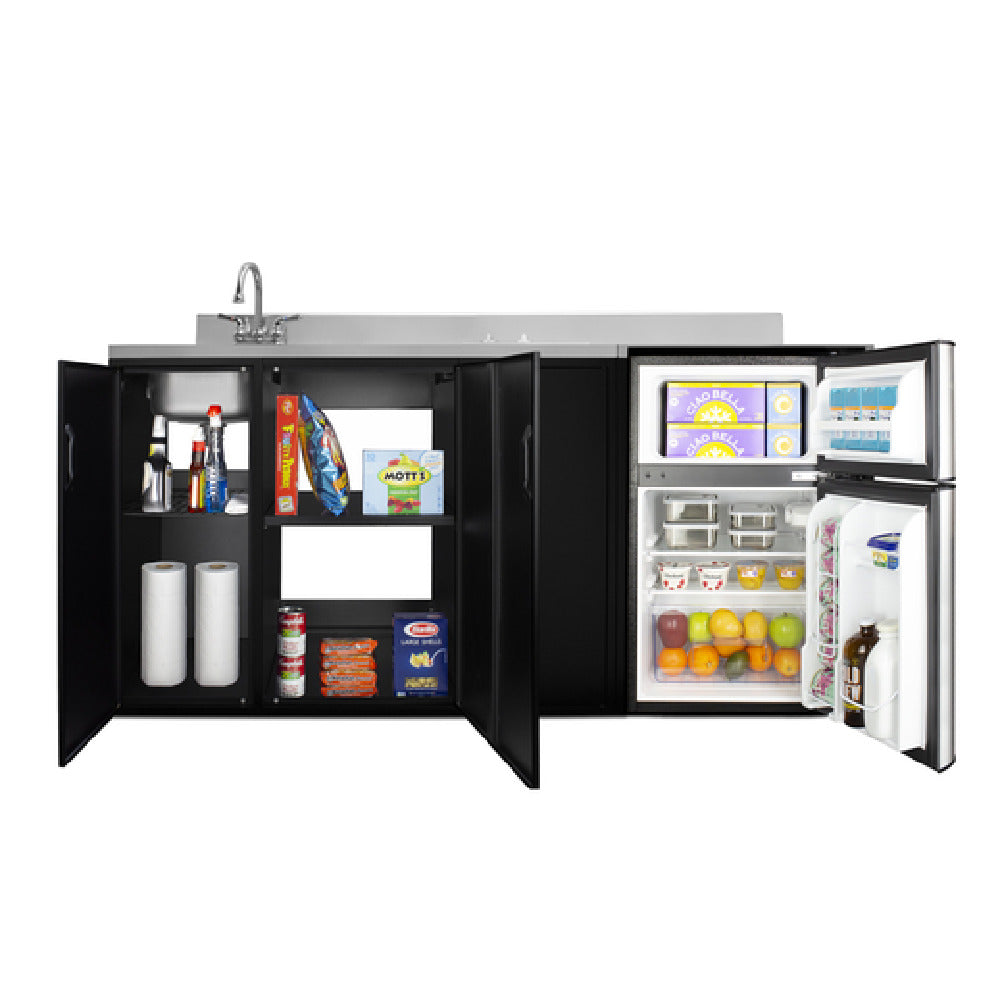 The Summit CK72ADASINKL All-in-One Kitchenette is a comprehensive kitchen solution measuring 71.75"W x 23.75"D x 34"H, designed to optimize space with its one-piece stainless steel top and deep drawn sink. This versatile unit features a left-hand positioned faucet and a (2) burner smooth top electric cooktop, ensuring efficient meal preparation. The integrated 3.2 cu.ft. refrigerator-freezer with cycle defrost (CP34BSS) provides ample cold storage, while the lower cabinet storage compartment with a shelf offers additional space for kitchen essentials. The kitchenette's black and stainless steel door finish, complemented by black metal sides, presents a sleek aesthetic suitable for various environments. Operating at 1.4kW with (2) 115v/60/1-ph and 21.1 amps, this unit is ETL and cETL listed, ensuring safety and performance standards are met. ADA Compliant for residential use, the Summit CK72ADASINKL is a practical choice for residential settings, commercial break rooms, or any location requiring an efficient, compact kitchen setup. With the advantage of shipping on one pallet, installation is simplified, further enhancing its appeal across multiple market segments. This all-in-one kitchenette stands out for its cohesive design and functionality, making it a versatile addition to any small-scale culinary space.