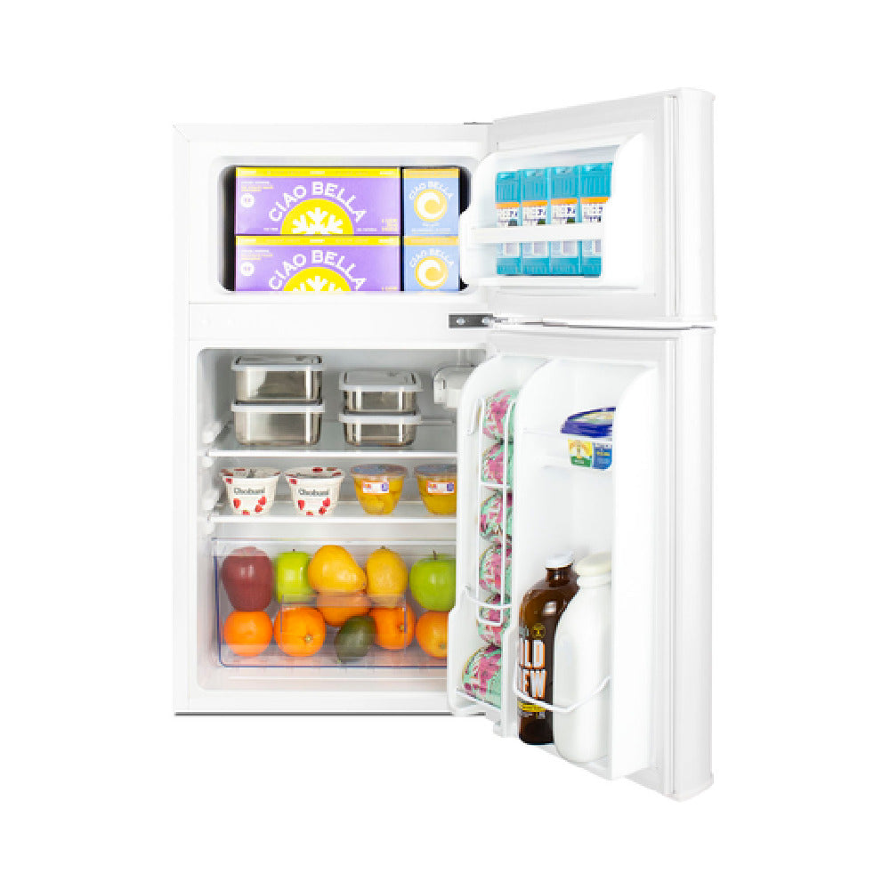 The Summit CP34WADA Compact Refrigerator-freezer - 2-door Design Freestanding Use is an innovative appliance crafted for both residential and commercial environments, particularly suited for ADA applications with its lower height. This unit stands out with its ENERGY STAR qualification, showcasing its energy efficiency. The refrigerator features a white cabinet with reversible doors for flexible installation options. Inside, you’ll find door racks and a can dispenser for organized storage, along with a glass shelf and a crisper drawer for fresh produce. The cycle defrost system ensures hassle-free maintenance. It comes equipped with an interior light to enhance visibility, and a sealed back design for space efficiency. The package includes an ice scraper and ice cube tray, adding to its convenience. Environmentally conscious users will appreciate the R600a eco-friendly hydrocarbon-based refrigerant, which is CARB compliant. For safety and reliability, it holds UL and UL-C certifications. Designed to operate on a 115V/60 Hz electrical system, this compact refrigerator-freezer is a versatile and practical choice for various segments, offering a combination of functionality and accessibility.