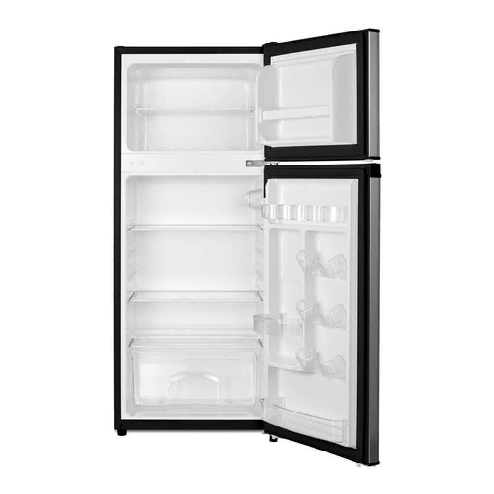 The Summit CP73PL Compact Refrigerator-Freezer Freestanding One-section is a versatile appliance designed to meet diverse refrigeration needs with precision. Measuring 18-1/2 inches in width, this compact unit provides a 4.5 cubic feet capacity, suitable for both commercial and residential environments requiring efficient space utilization. Its rear mount self-contained refrigeration system ensures optimal cooling performance, while the cycle defrost feature aids in maintaining consistent temperature control. The unit is equipped with two reversible solid right-hinged doors, enhancing accessibility and convenience in placement. Inside, six refrigerator shelves, one freezer shelf, and a crisper drawer offer organized storage solutions. The dial thermostat allows user-friendly temperature adjustments, complemented by LED lighting that illuminates the white interior for enhanced visibility. Externally, the refrigerator boasts a stainless steel front that adds a sleek, modern aesthetic, contrasted by durable black sides. Leveling legs provide stability on uneven surfaces, making it adaptable to various settings. Operating at 115 volts with a 60 Hertz single-phase power supply and drawing 1.4 amps, this refrigerator is CSA, cCSA, and ADA Compliant for residential use, ensuring it meets stringent safety and accessibility standards. The Summit CP73PL is a practical choice for customers seeking compact and efficient refrigeration solutions.