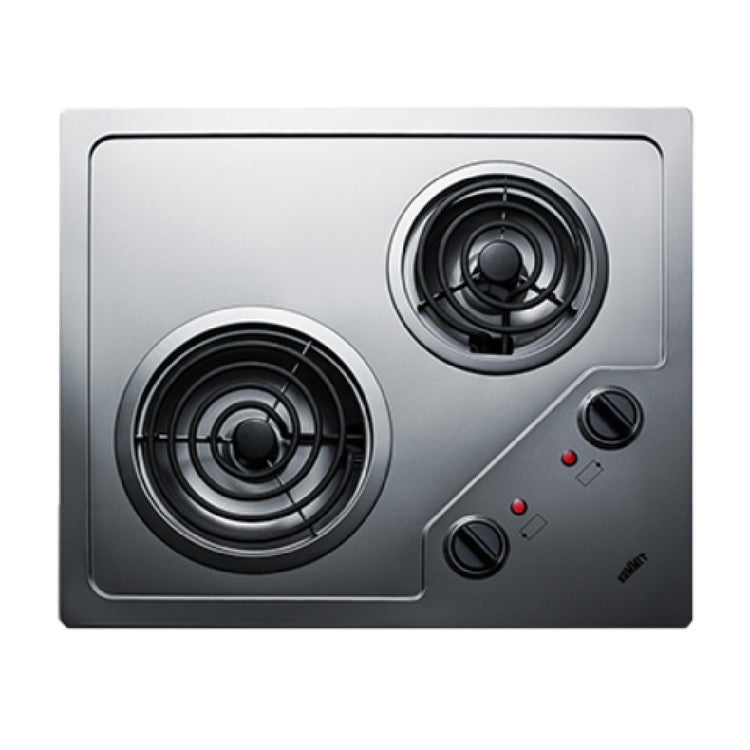 The Summit CR2B122 Radiant Cooktop Electric 21-1/4" W is a compact and versatile cooking solution designed for both residential and commercial use. This two-burner cooktop, measuring 21-1/4 inches in width, features a sleek stainless steel finish that enhances its durability and aesthetic appeal. The unit's coil elements provide consistent and efficient heat distribution, making it ideal for a variety of cooking needs. With dimensions of 20 inches in width, 16 inches in depth, and 3 inches in height, this cooktop can be mounted in either a portrait or landscape style, offering flexible installation options to suit different kitchen layouts. The push-to-turn knobs ensure safe operation, while the residual heat indicator adds an extra layer of safety by alerting users to still-hot surfaces. Operating on a 115v/60/1-ph electrical supply, the Summit CR2B122 is equipped with a cord for easy connectivity. It is ETL and cETL certified for residential use, underscoring its compliance with safety standards. This radiant cooktop is an excellent choice for kitchens where space efficiency and reliability are paramount, providing a practical solution that caters to diverse culinary demands.