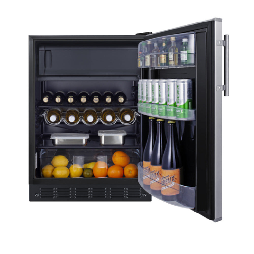 The Summit CT66BK2SSADA Refrigerator-Freezer 24" Wide ADA Compliant unit is a versatile and compact solution designed to meet the storage needs of various commercial settings. This model offers a 4.9 cu.ft capacity, making it an excellent choice for environments where space efficiency is paramount. Featuring a sleek black exterior and a smudge-proof stainless steel door with a durable stainless steel handle, this refrigerator-freezer ensures both aesthetic appeal and functional durability. It is designed with counter height dimensions and includes a reversible door for flexible placement options. The automatic defrost operation in the fresh food section and an efficient manual defrost operation in the freezer compartment highlight its advanced design. Inside, the unit boasts an automatic interior light, a black interior, a removable crisper drawer, and three adjustable glass shelves, including a bottle shelf for organized storage. The appliance operates quietly and is equipped with dial controls, R600a hydrocarbon refrigerant, and is CARB compliant, ensuring eco-friendly performance. Additionally, it is 100% CFC free and meets ETL and ETL-C residential standards. This Summit model is an ADA compliant option, catering to diverse market segments in need of accessible and efficient refrigeration solutions.