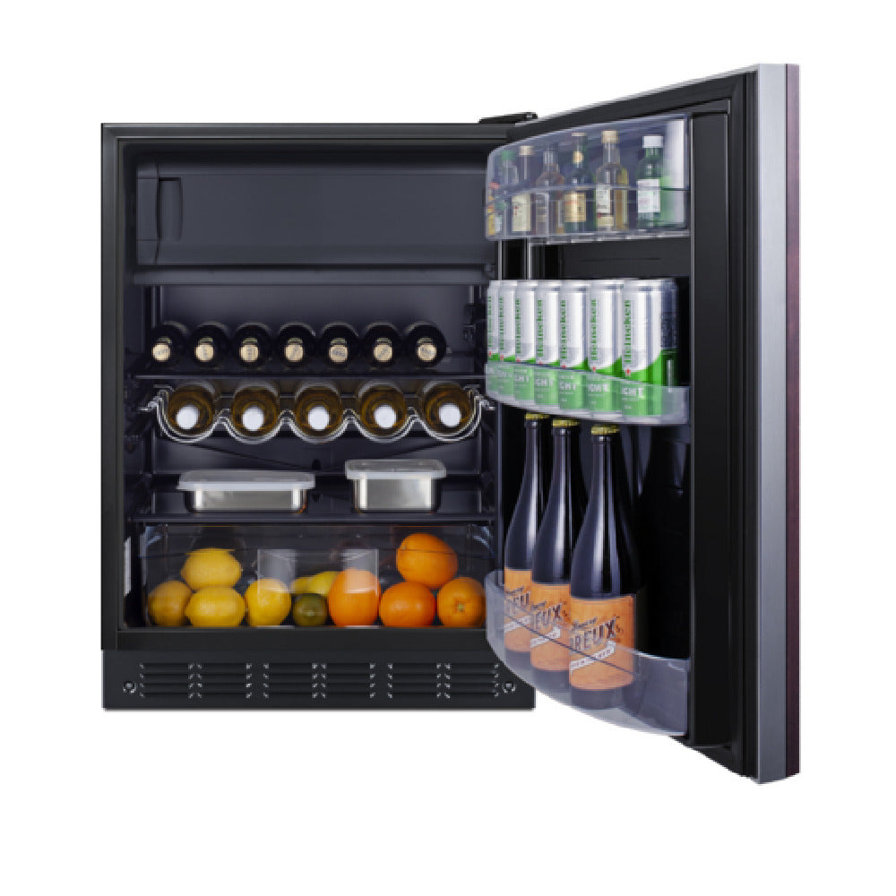 The Summit CT66BK2SSIFADA Refrigerator-Freezer 24" Wide ADA Compliant model is a versatile cooling solution designed to meet a variety of needs in both residential and commercial settings. With a compact 24-inch width and counter height dimensions, it offers a 4.9 cu.ft capacity, making it suitable for tight spaces while adhering to ADA compliance standards. The unit features a sleek black exterior with a panel-ready door design, allowing customization to match surrounding cabinetry. Its efficient cooling operations include automatic defrost in the fresh food section and manual defrost in the freezer compartment, ensuring optimal performance and energy conservation. The refrigerator is equipped with a black interior, automatic interior light, and a removable crisper drawer for convenient storage. Three adjustable glass shelves and a bottle shelf provide flexible organizing options, while door storage enhances accessibility. The right swing door is supported by two level legs for stability. Quiet operation is ensured through the use of R600a hydrocarbon refrigerant, which is both CARB compliant and 100% CFC free. This model operates on a 115v/60/1-ph power supply and meets ETL and ETL-C (Residential) standards, making it an environmentally conscious and reliable choice for diverse refrigeration needs.
