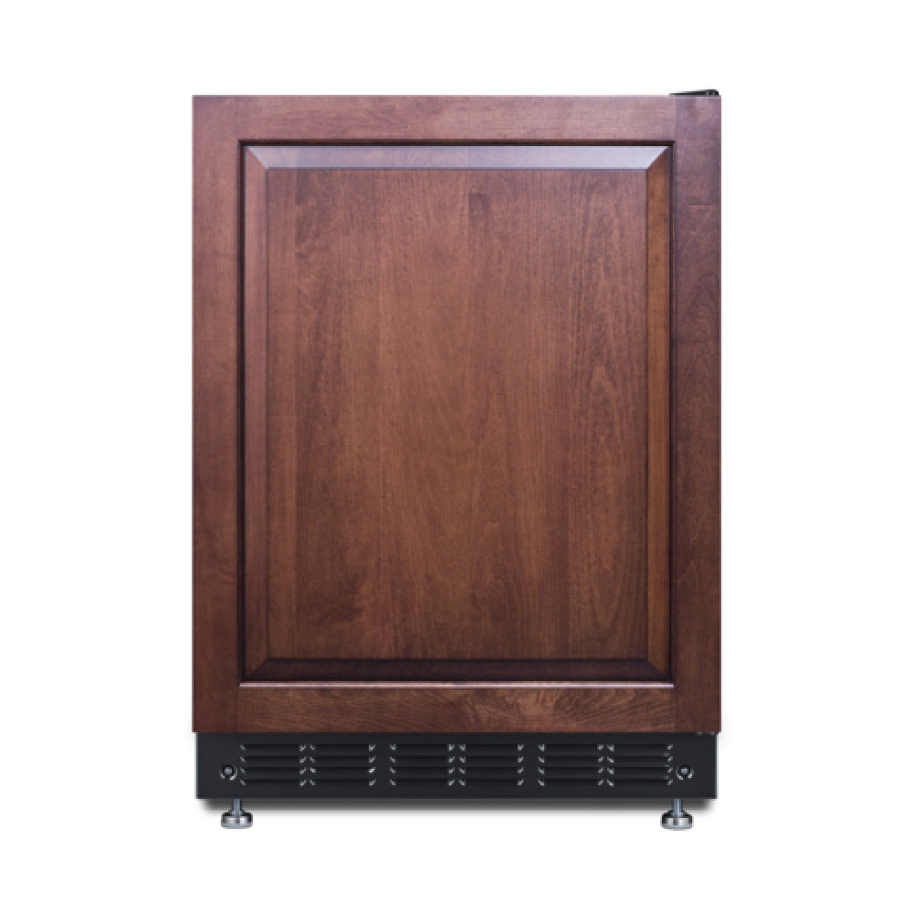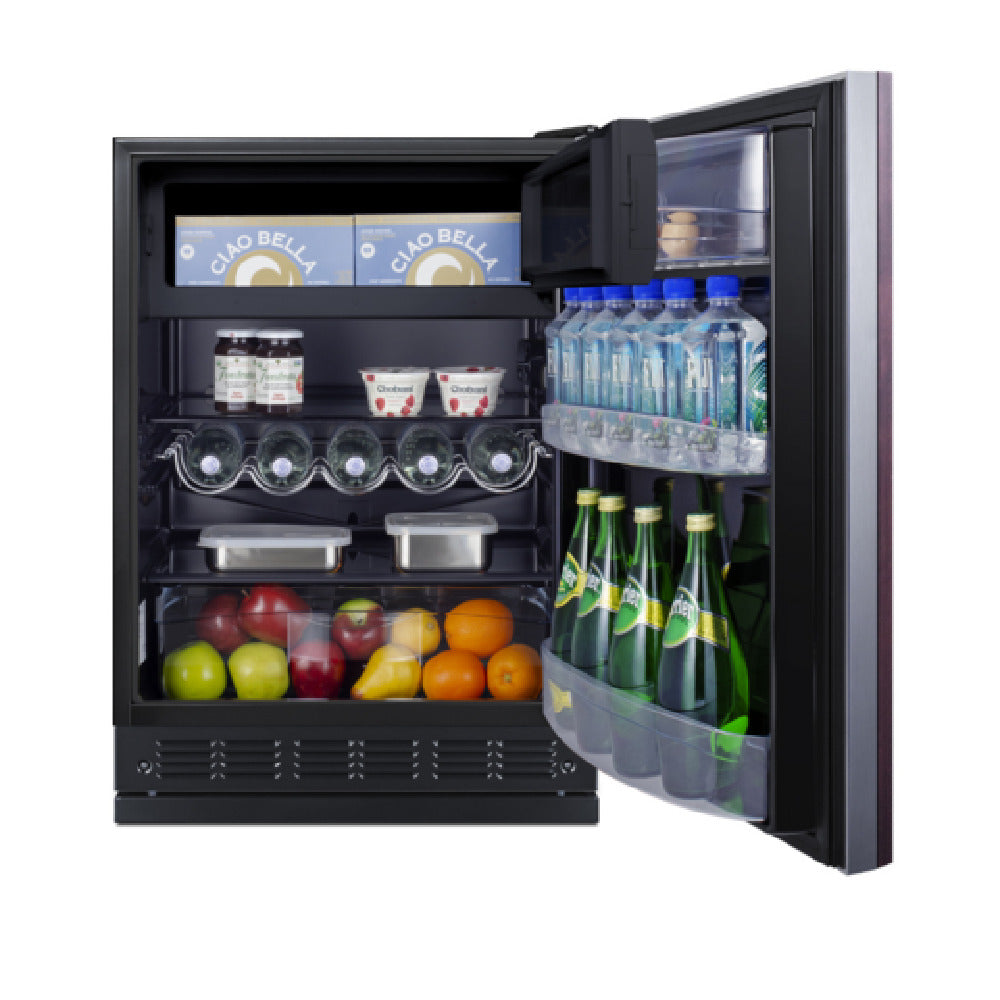 The Summit CT66BK2SSRSIF Refrigerator-Freezer 24" Wide 4.9 Cu.ft is a versatile appliance designed to meet the diverse needs of both residential and commercial settings. With a sleek black exterior, this unit features a compact, counter-height design and a width of 24 inches, allowing for seamless integration into various spaces. It offers a capacity of 4.9 cubic feet, providing ample storage within its panel-ready door and right swing configuration. The refrigerator section includes automatic defrost operation, while the freezer compartment employs efficient manual defrosting. Inside, the unit boasts a removable crisper drawer, three adjustable glass shelves, and a bottle shelf, all illuminated by an automatic interior light. The black interior complements its modern aesthetics. The CT66BK2SSRSIF operates quietly, powered by the R600a hydrocarbon refrigerant, which is both CARB compliant and 100% CFC free. It includes two level legs and dial controls for ease of use. Safety and quality are assured with ETL and ETL-C (Residential) certifications. This model is equipped with a leg shield and height adjustability, enhancing its adaptability to different environments. Ideal for those seeking a compact yet efficient refrigeration solution, the Summit CT66BK2SSRSIF stands out in its class.