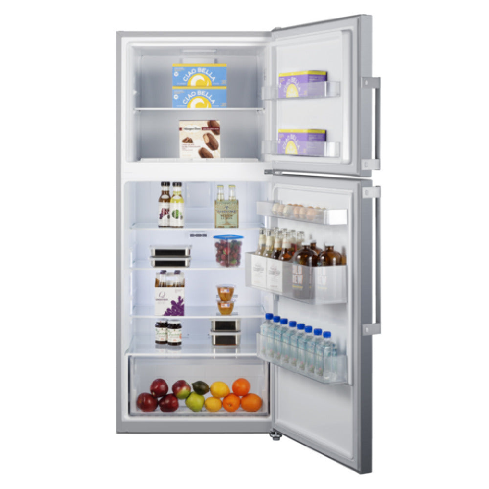 The Summit FF1513SS Refrigerator-Freezer Reach-in 28" Wide is a versatile appliance designed for both residential and commercial use, with a focus on convenience and energy efficiency. With a substantial 16.63 cubic feet capacity, this unit provides ample space for storing a variety of items, making it suitable for kitchen environments where space optimization is key. The refrigerator-freezer features a counter-depth design, ensuring it blends seamlessly with existing cabinetry. The stainless steel door and platinum cabinet provide a sleek, modern aesthetic, complemented by brushed steel handles for an elegant finish. Equipped with an adjustable touch control thermostat and adjustable glass shelves, the FF1513SS allows for customized storage configurations to meet diverse needs. A reversible door offers flexibility in installation, while gallon door storage and door racks maximize space efficiency. The unit includes a large crisper for fresh produce and interior LED lighting for easy visibility. Its frost-free operation ensures minimal maintenance, and the vacation setting allows for energy savings when the unit is not in regular use. The sealed back design helps maintain a sleek profile, and the use of R600a hydrocarbon refrigerant makes it environmentally friendly and CARB compliant. Meeting UL, UL-C, and Energy Star standards, this refrigerator-freezer is both reliable and sustainable.