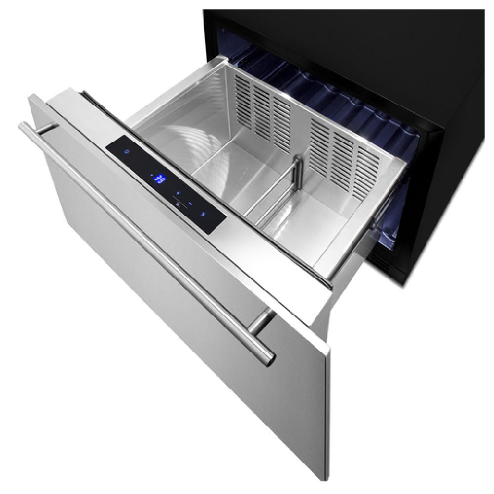 The Summit FF1DSS24 All-Refrigerator Built-in Or Freestanding Indoor/outdoor Compatible is a versatile refrigeration unit designed to meet the demanding needs of various market segments, from commercial to residential applications. With a width of 23-1/2 inches and a spacious 1.6 cubic feet interior, this all-refrigerator model offers ample storage capacity. The unit is equipped with a single stainless steel drawer featuring a convenient handle, complemented by a frost-free defrost mechanism to ensure optimal performance and minimal maintenance. A digital thermostat allows precise temperature control, while the LED interior light provides clear visibility of stored contents. The refrigerator's exterior showcases a stainless steel front that is panel ready and black side panels, adding a sleek aesthetic suitable for any environment. Inside, the stainless steel interior enhances durability and hygiene. Level legs ensure stability on any surface, and the unit operates using R600A Hydrocarbon refrigerant, noted for its eco-friendly properties. With an electrical requirement of 115 volts, 60 hertz, and a single-phase 1.0 amp connection, the FF1DSS24 is both ETL and cETL listed, and it meets ETL-Sanitation standards for commercial use. This product's indoor and outdoor compatibility makes it an ideal choice for diverse settings, offering reliability and modern design.