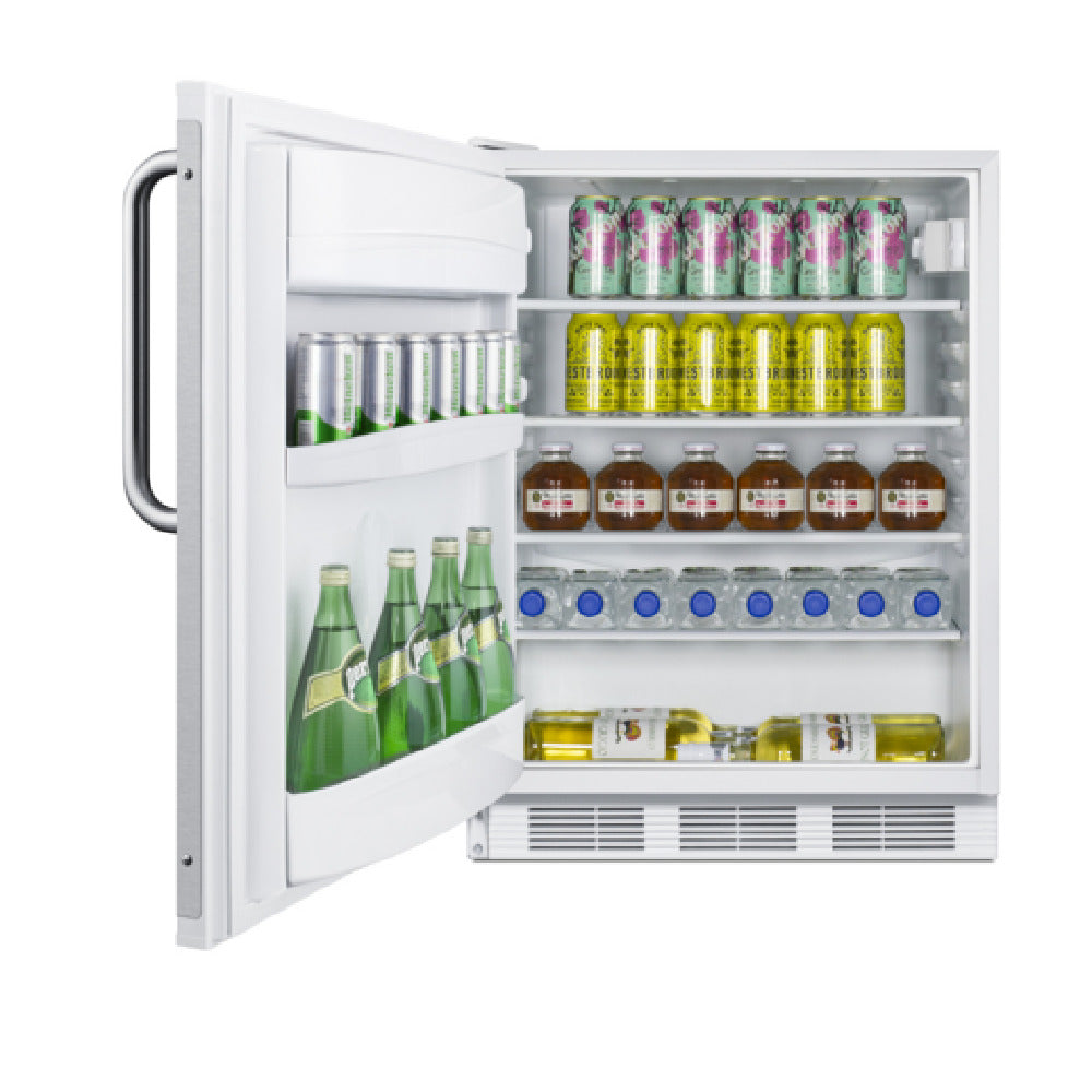 Summit Commercial, FF6W7BZADALHD, All-refrigerator, ADA compliant, 24" wide, 5.5 cu.ft, white exterior, brushed stainless steel handle, door storage, left hand door swing, magnetic door gasket, automatic defrost, automatic interior light, white interior, removable crisper drawer, 3 adjustable wire shelves, dial controls, includes a removable Beverage Zone decal, R600a hydrocarbon refrigerant, CARB compliant, 100% CFC free, 115V/60 Hz, ETL, ETL-C, ETL-S (Commercial - Residential)