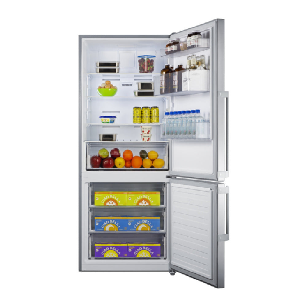 The Summit FFBF283SS Full Size Bottom Freezer Refrigerator is a versatile appliance designed to meet diverse refrigeration needs. This refrigerator offers a 14 cu.ft. interior capacity and features a counter depth design, making it an excellent choice for various kitchen layouts where space efficiency is critical. Equipped with digital thermostats and ENERGY STAR certification, it ensures energy-efficient cooling performance. The unit features a reversible stainless steel door and a platinum cabinet, providing both durability and a modern aesthetic. Its frost-free operation minimizes maintenance, while high temperature and open door alarms enhance safety and convenience. The interior is well-organized with (3) adjustable glass shelves, (3) full door shelves, and (3) transparent freezer drawers, all of which are illuminated by LED lighting. The appliance is powered by R600a refrigerant, which is 100% CFC free and CARB compliant, promoting an environmentally friendly operation. Additionally, its sealed back and ultra-quiet operation make it suitable for residential environments without causing disturbances. Operating on 115V/60 Hz and certified by UL and ULC for residential use, this refrigerator combines advanced technology and thoughtful design to serve the needs of a wide range of consumers in the household refrigeration market.