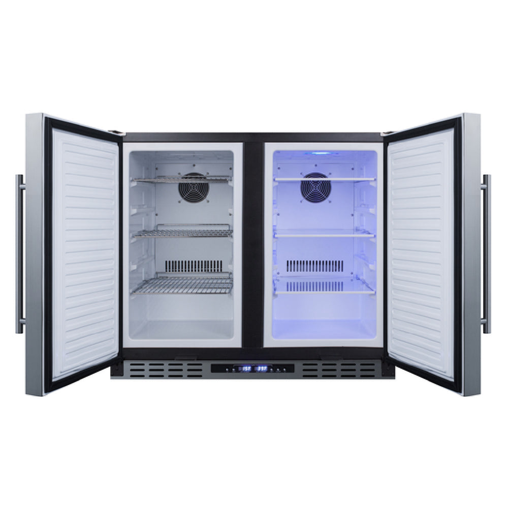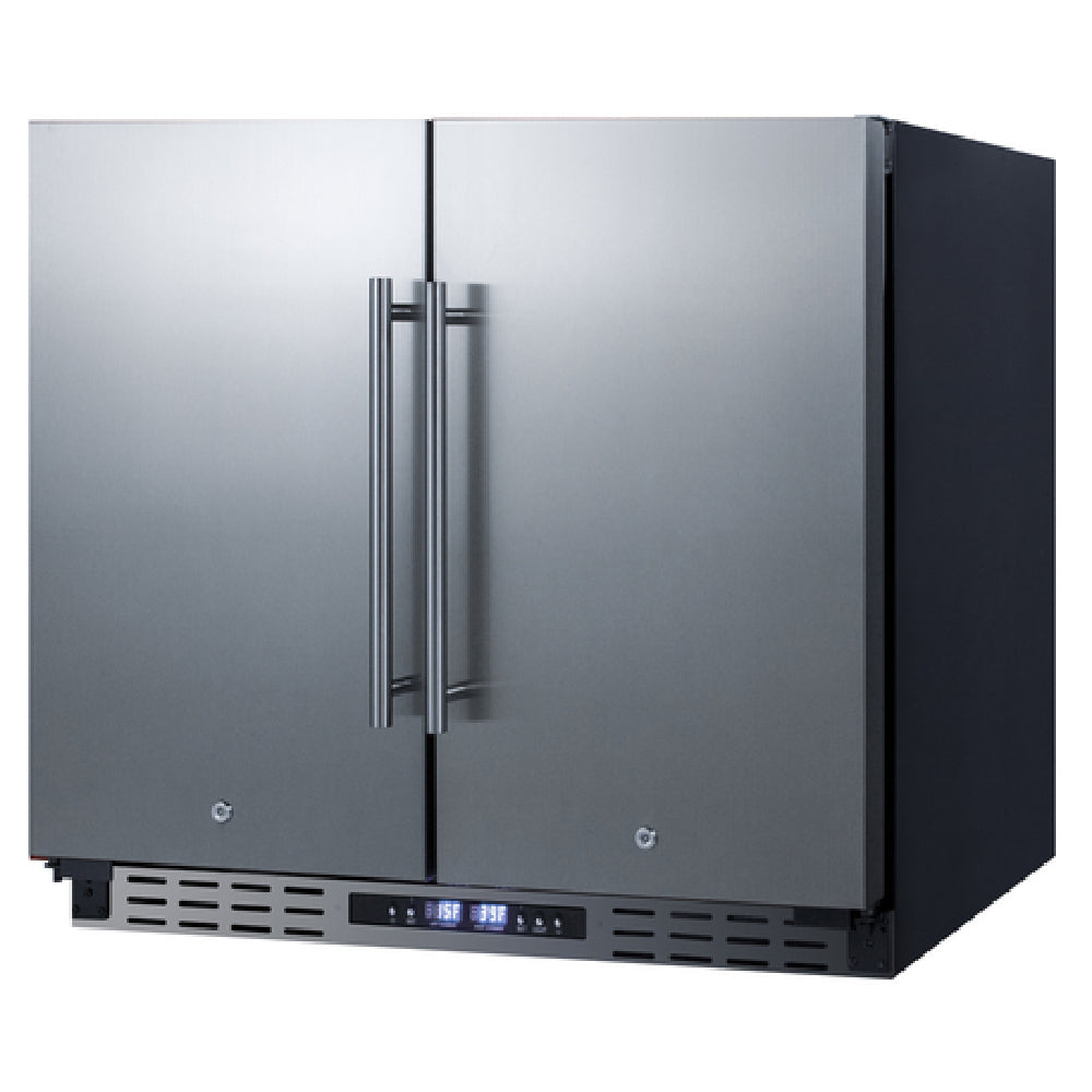 The Summit FFRF36ADA Refrigerator-Freezer Single Compressor Built-in Or Freestanding is a versatile refrigeration unit designed to meet both commercial and residential needs with ADA-compliant height. This model provides a total capacity of 5.8 cubic feet, divided into separate refrigerator and freezer compartments for efficient storage. The unit measures 35.5 inches in width, 24.25 inches in depth, and 31.5 inches in height, making it suitable for both built-in and freestanding installations. It operates within a refrigerator temperature range of 36°F to 46°F and a freezer temperature range of -22°F to 46°F, offering flexibility in storage conditions. The French door swing design, complemented by stainless steel doors and handles with a sleek black exterior, adds both functionality and style. It includes three adjustable glass shelves and three adjustable chrome shelves, along with two front locks for security. A digital thermostat and automatic defrost feature ensure easy control and maintenance, supported by energy-efficient R600a refrigerant. The LED lighting enhances visibility inside the unit. With electrical specifications of 115v/60/1-ph and 1.3 amps, and certification by ETL and ETL-Sanitation for commercial use, this refrigerator-freezer is a reliable choice for a variety of market segments seeking performance and compliance.