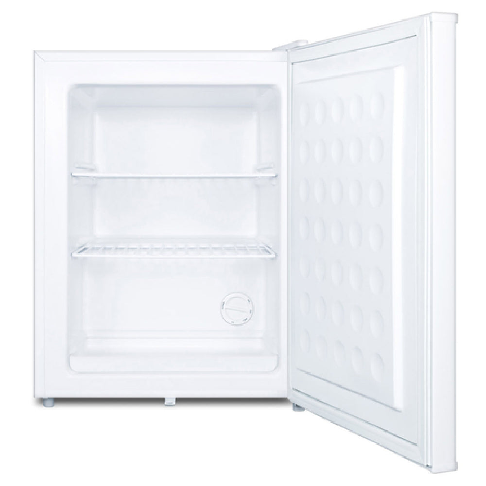 The Summit FS30LMC Accucold MOMCUBE™ Breast Milk Freezer Countertop One Section is a specialized unit tailored for optimal breast milk storage, featuring a compact design with an 18-1/2" width that fits seamlessly on countertops. This freezer offers a storage capacity of 1.8 cubic feet, adequately housing essential storage needs within a confined space. It is equipped with a solid, hinged reversible door that includes a lock, ensuring the security and integrity of the contents. Inside, users will find two adjustable wire shelves, allowing for customizable organization. The unit operates using a manual defrost system, managed through a dial thermostat that provides precise temperature control. Aesthetically, the freezer is finished in a clean white exterior, complemented by leg levelers for stability on uneven surfaces. The rear mount self-contained refrigeration system utilizes R600a Hydrocarbon refrigerant, known for its environmentally friendly properties. This model operates on 115V/60 Hz with an energy-efficient draw of 0.8 amps. Furthermore, it holds an ETL (Medical) certification, highlighting its adherence to rigorous safety and efficiency standards. The Summit FS30LMC is an essential appliance for medical and personal applications, offering reliable, secure, and efficient breast milk storage solutions.